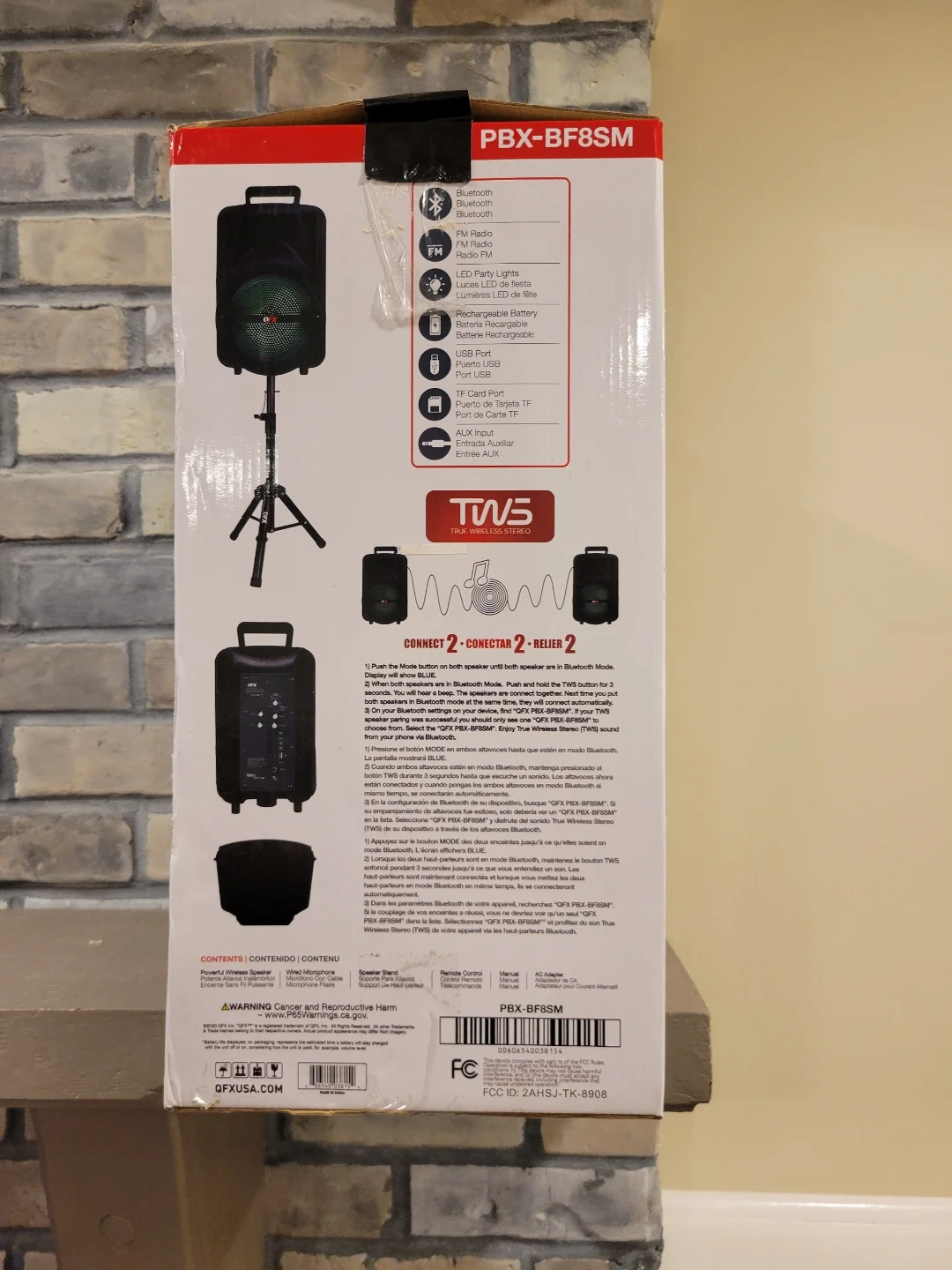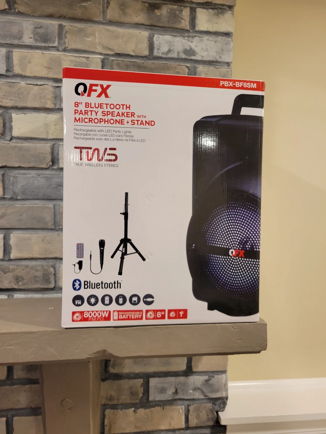 This is an 8" QFX Bluetooth party speaker with a microphone stand. It features True Wireless Stereo (TWS) capabilities and Bluetooth connectivity. Includes original box and accessories.