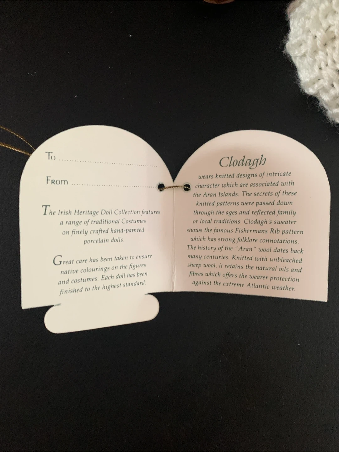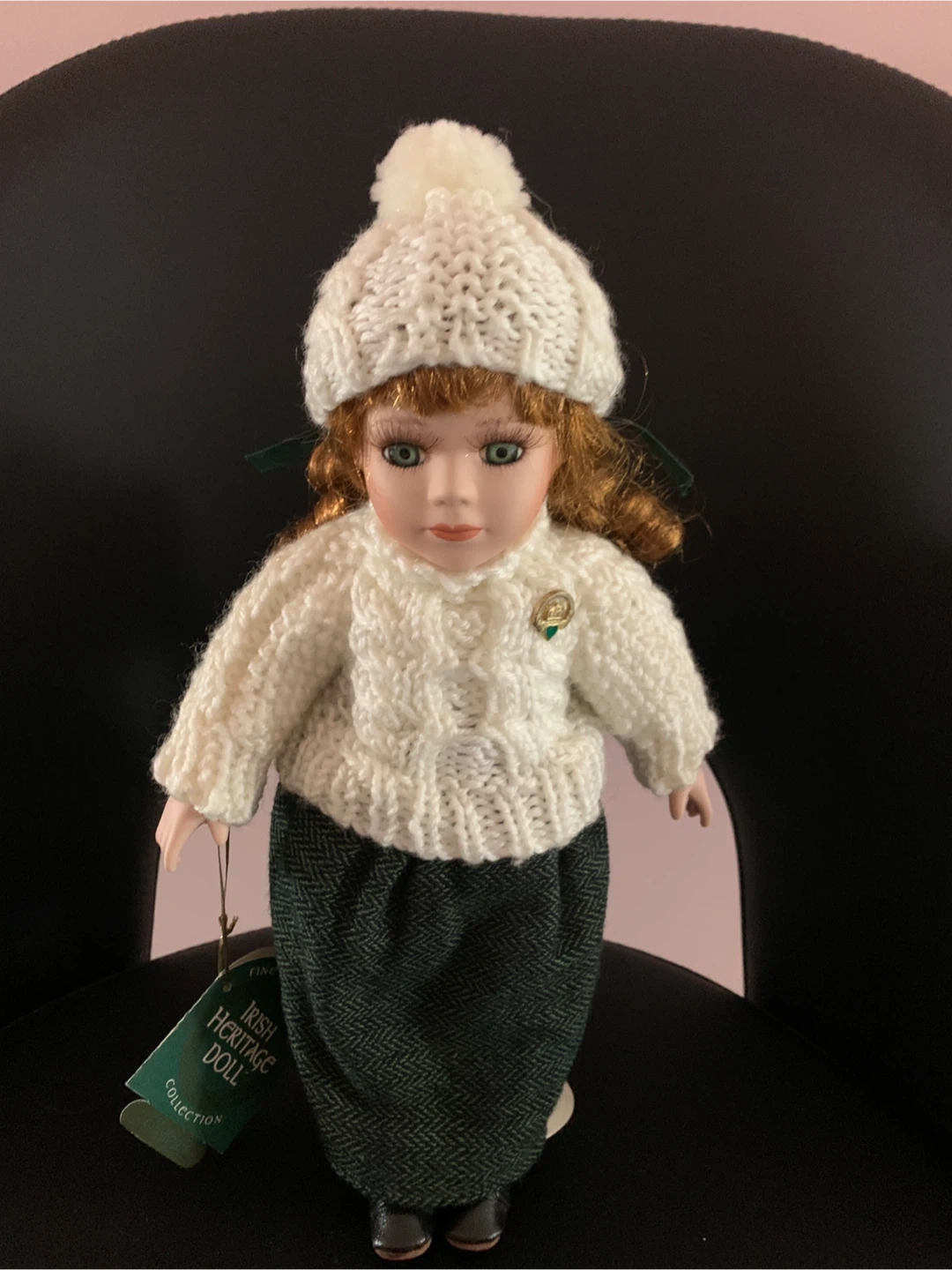 18This doll is from The Irish Heritage Doll Collection, featuring a range of traditional costumes on finely crafted hand-painted porcelain dolls. Great care has been taken to ensure native colourings on the figures and costumes. Each doll has been finished to the highest standard. The doll wears knitted designs of intricate character which are associated with the Aran Islands. The secrets of these knitted patterns were passed down through the ages and reflected family or local traditions. Clodagh's sweater shows the famous Fishermans Rib pattern which has strong folklore connotations. Knitted with unbleached sheep wool, it retains the natural oils and fibres which offers the wearer protection against the extreme Atlantic weather