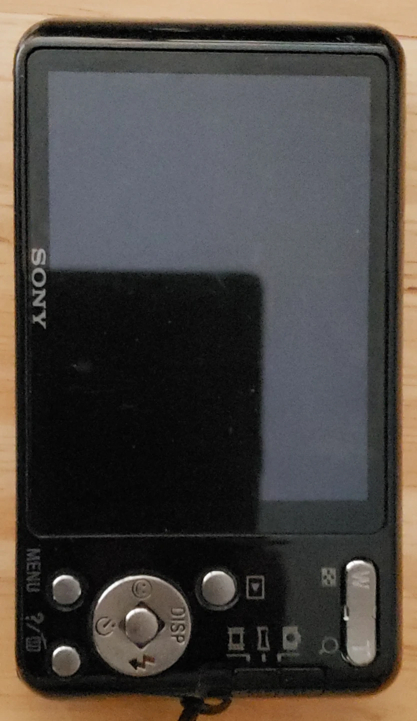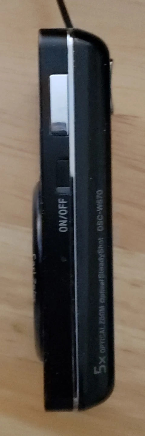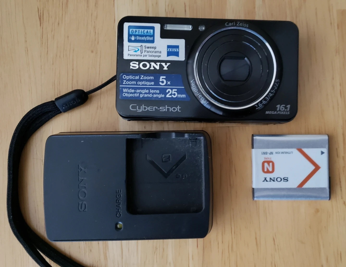 Selling a Sony Cyber-shot camera with 16.1 megapixels. It features a Vario-Tessar lens by Carl Zeiss, 5x optical zoom, and a 25mm wide-angle lens. Also includes Optical SteadyShot and Sweep Panorama features. The sale includes a battery and a wall charger.