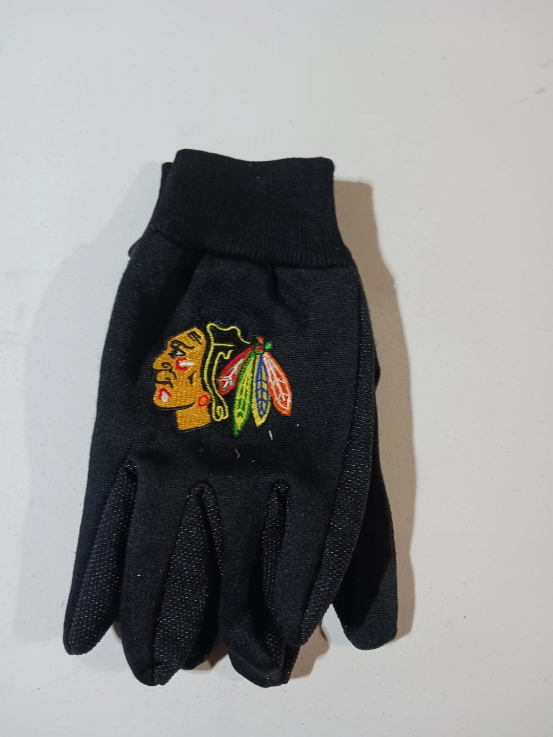 Selling a pair of black gloves with the Chicago Blackhawks logo embroidered on them. Made of a soft, flexible material for a comfortable fit. Great for any fan!