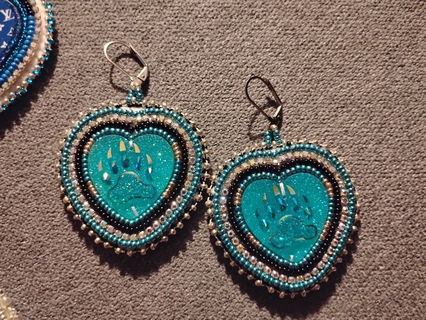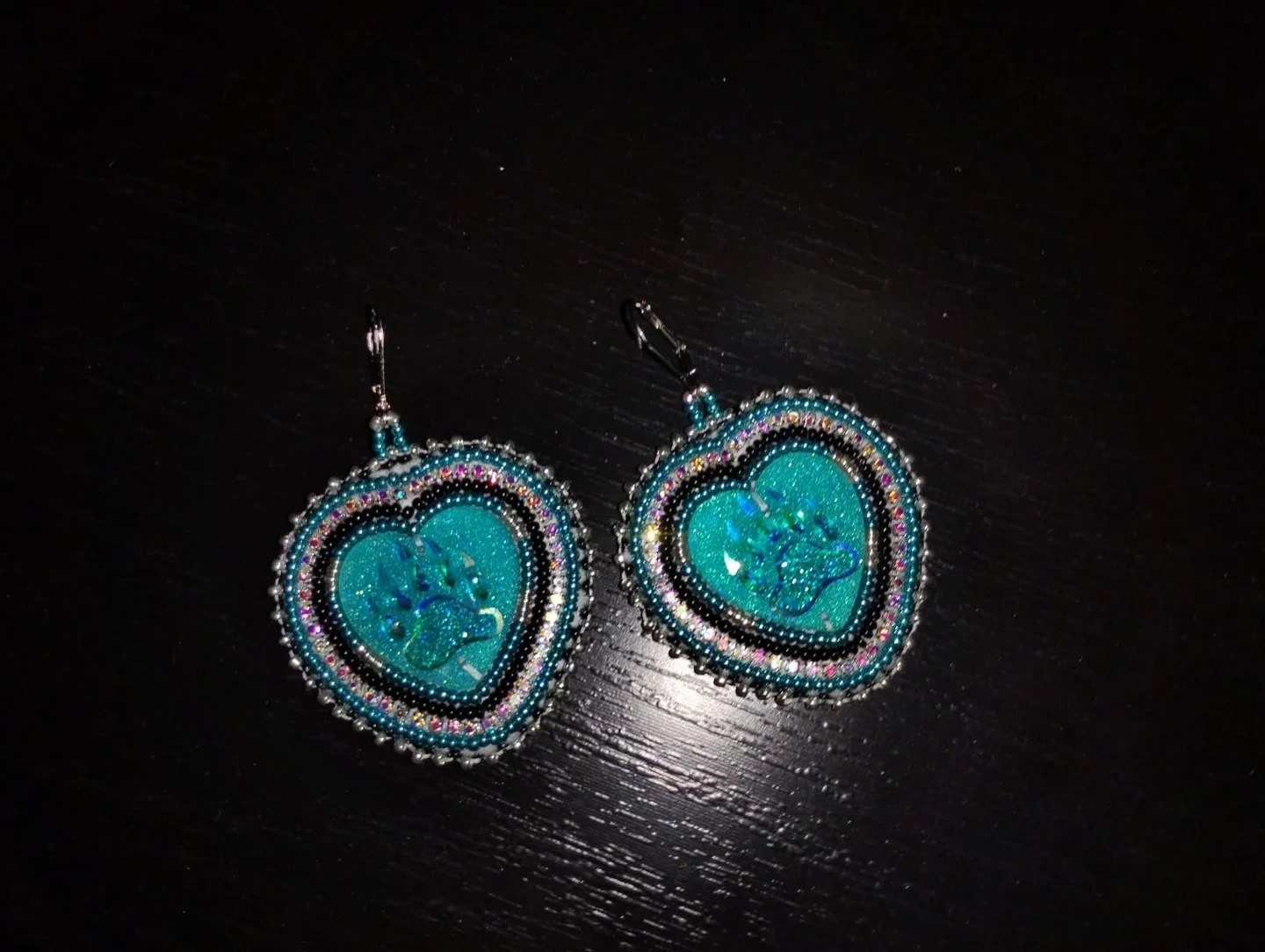 Handmade beaded heart earrings by myself in a vibrant teal colour. They feature a sparkly paw print design and dangle from fishhook ear wires. These unique earrings are perfect for adding a touch of personality to any outfit!