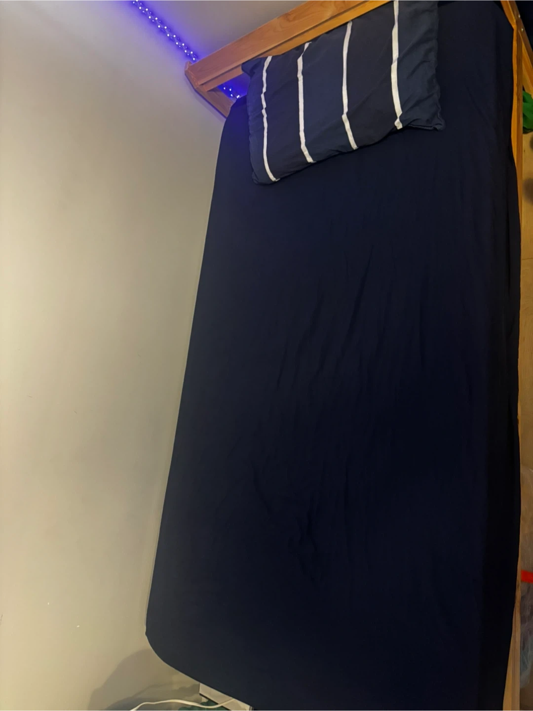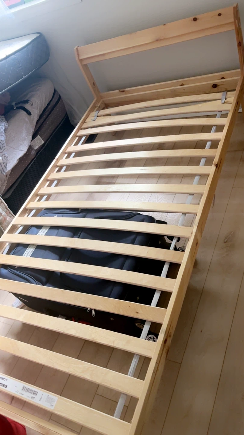 A simple wooden bed frame with a slatted base. It's made of natural wood and includes metal supports for the slats. This bed frame would be suitable for a single mattress. Price will negotiate.