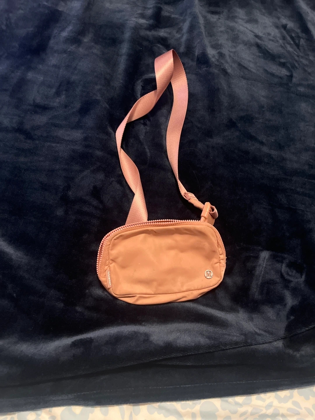 This is a Lululemon Everywhere Belt Bag in a peachy colour. It's made of nylon and has a zippered closure. The strap is adjustable.