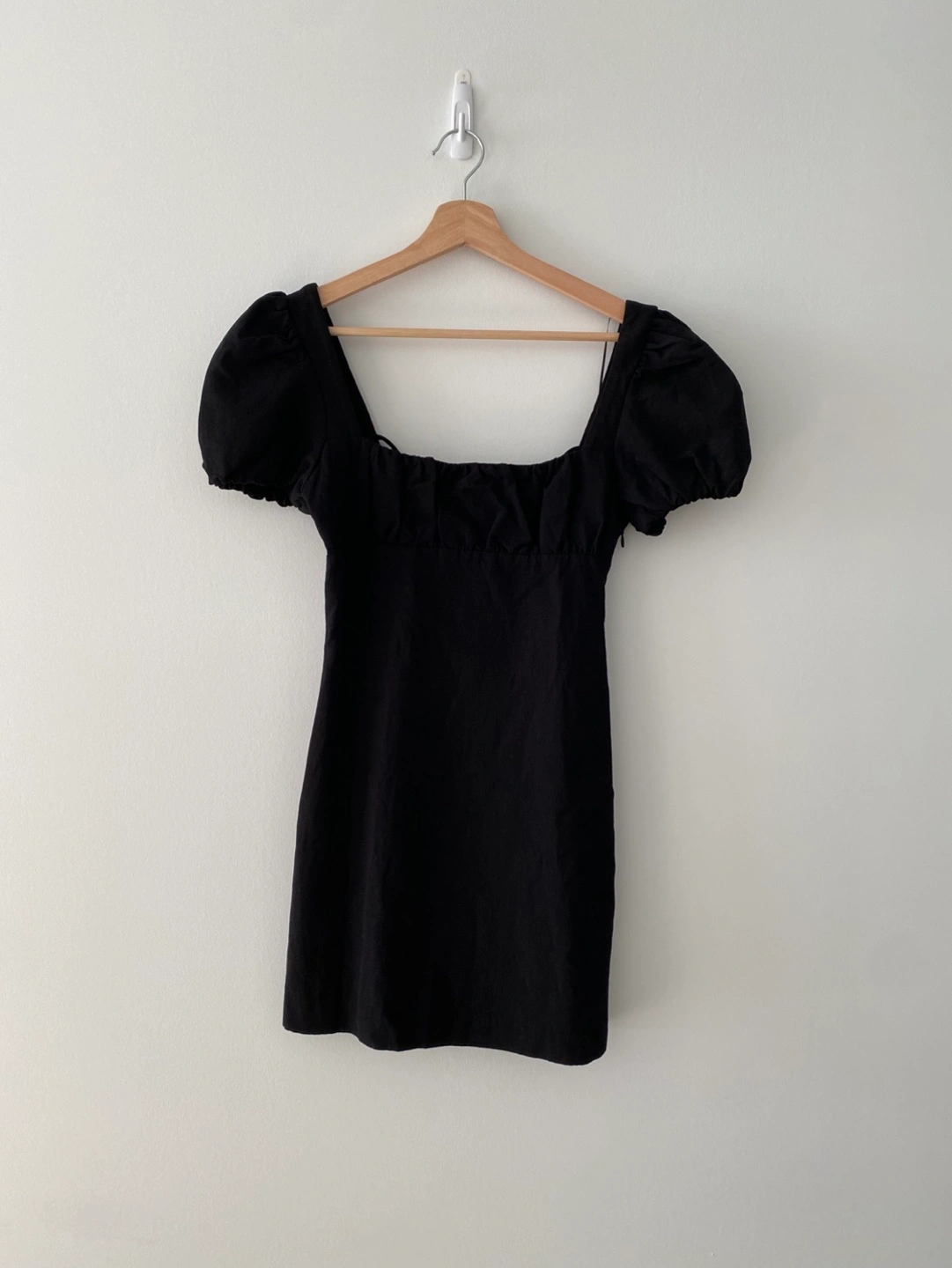 Adorable black mini dress. Features puff sleeves, square neckline, and a tie-up back. Size XS.
