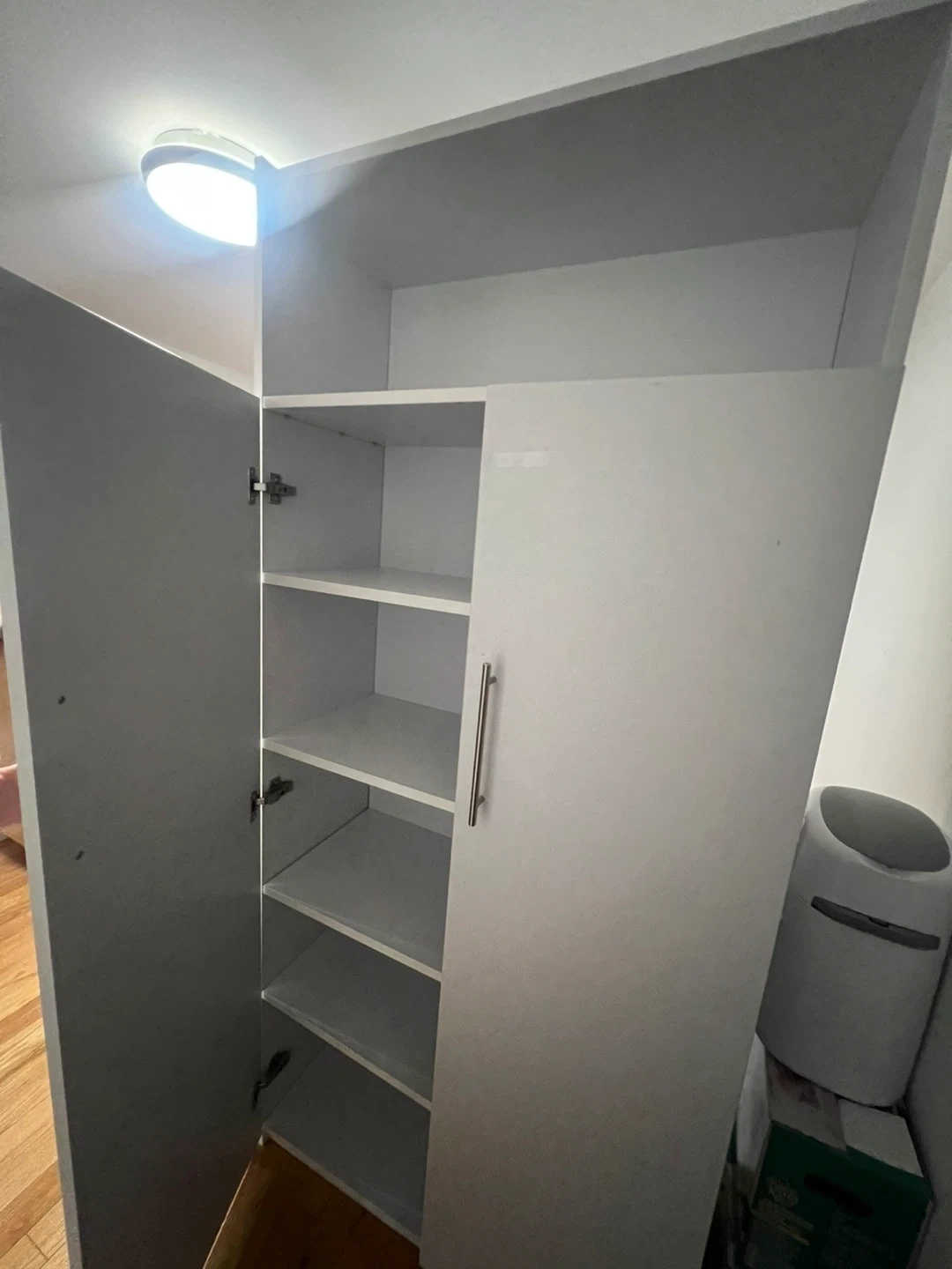 Here's a white wardrobe cabinet! It's in great shape and ready to help organize your space. It features shelving for easy storage and access. Perfect for any room!