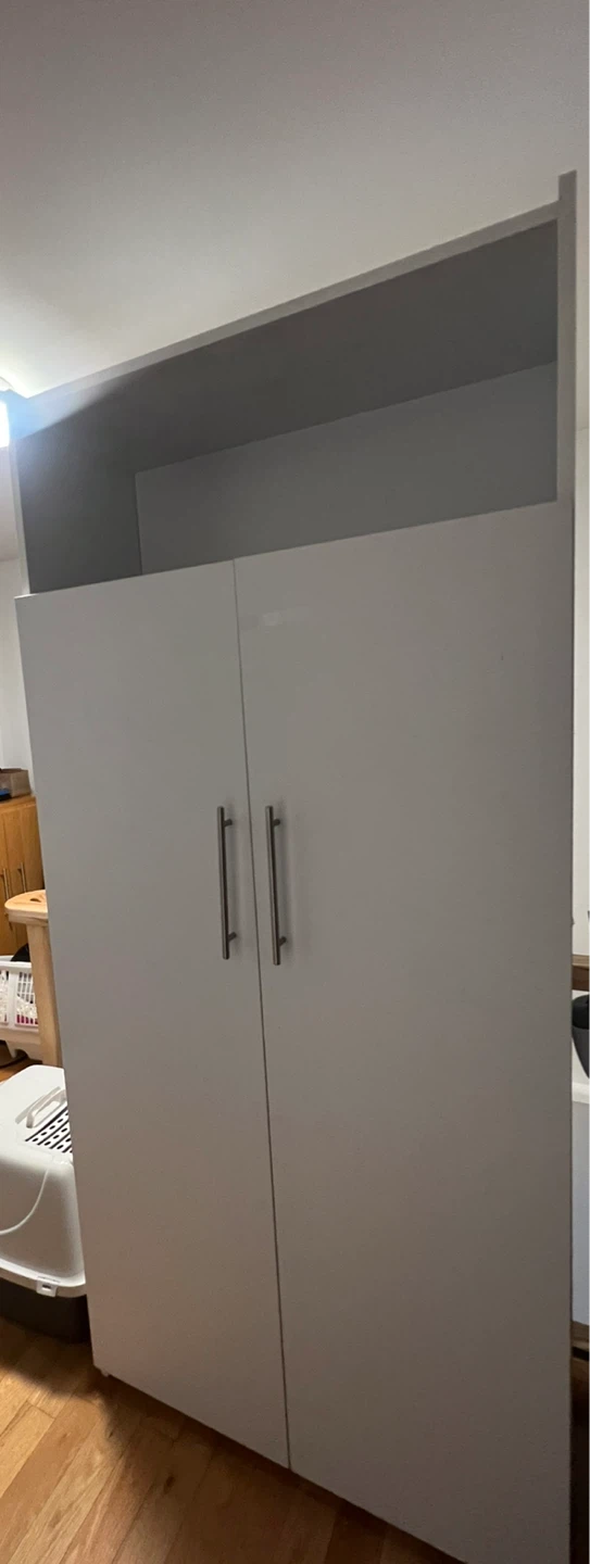 Here's a white wardrobe cabinet! It's in great shape and ready to help organize your space. It features shelving for easy storage and access. Perfect for any room!