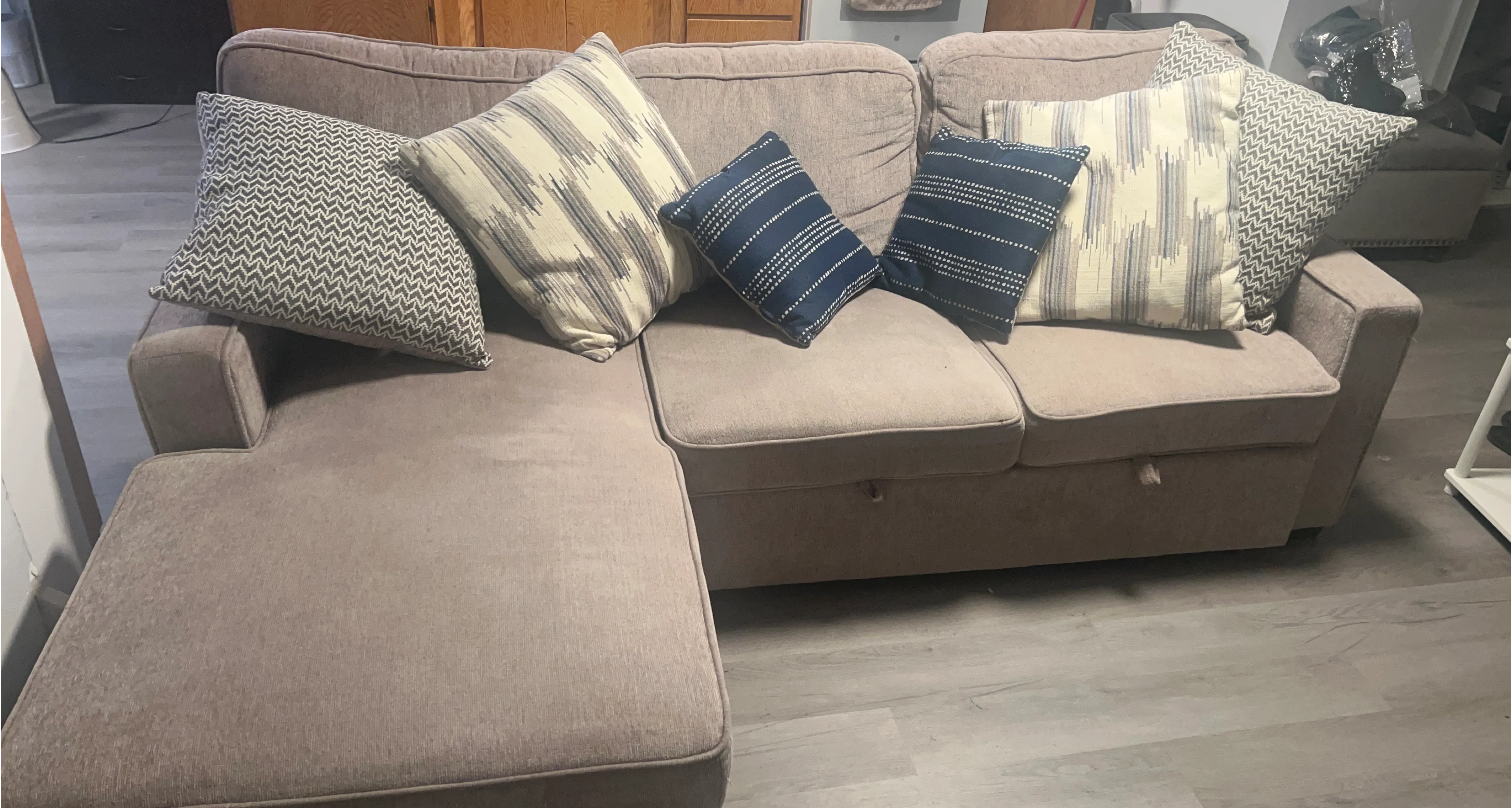This sectional couch offers ample seating with a built-in storage ottoman. It includes decorative throw pillows in various patterns. The chaise is reversible, allowing for flexible arrangement.