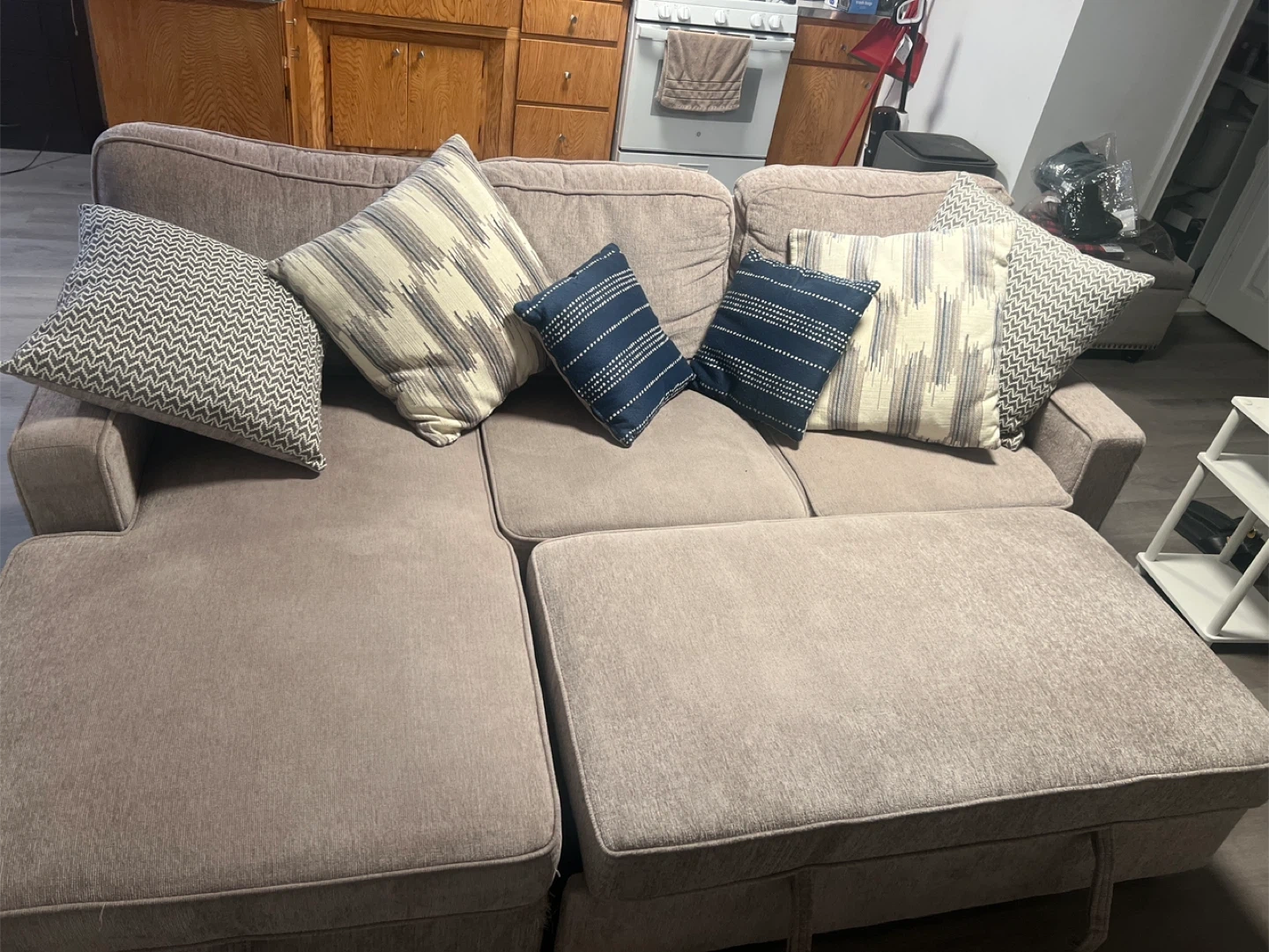 This sectional couch offers ample seating with a built-in storage ottoman. It includes decorative throw pillows in various patterns. The chaise is reversible, allowing for flexible arrangement.
