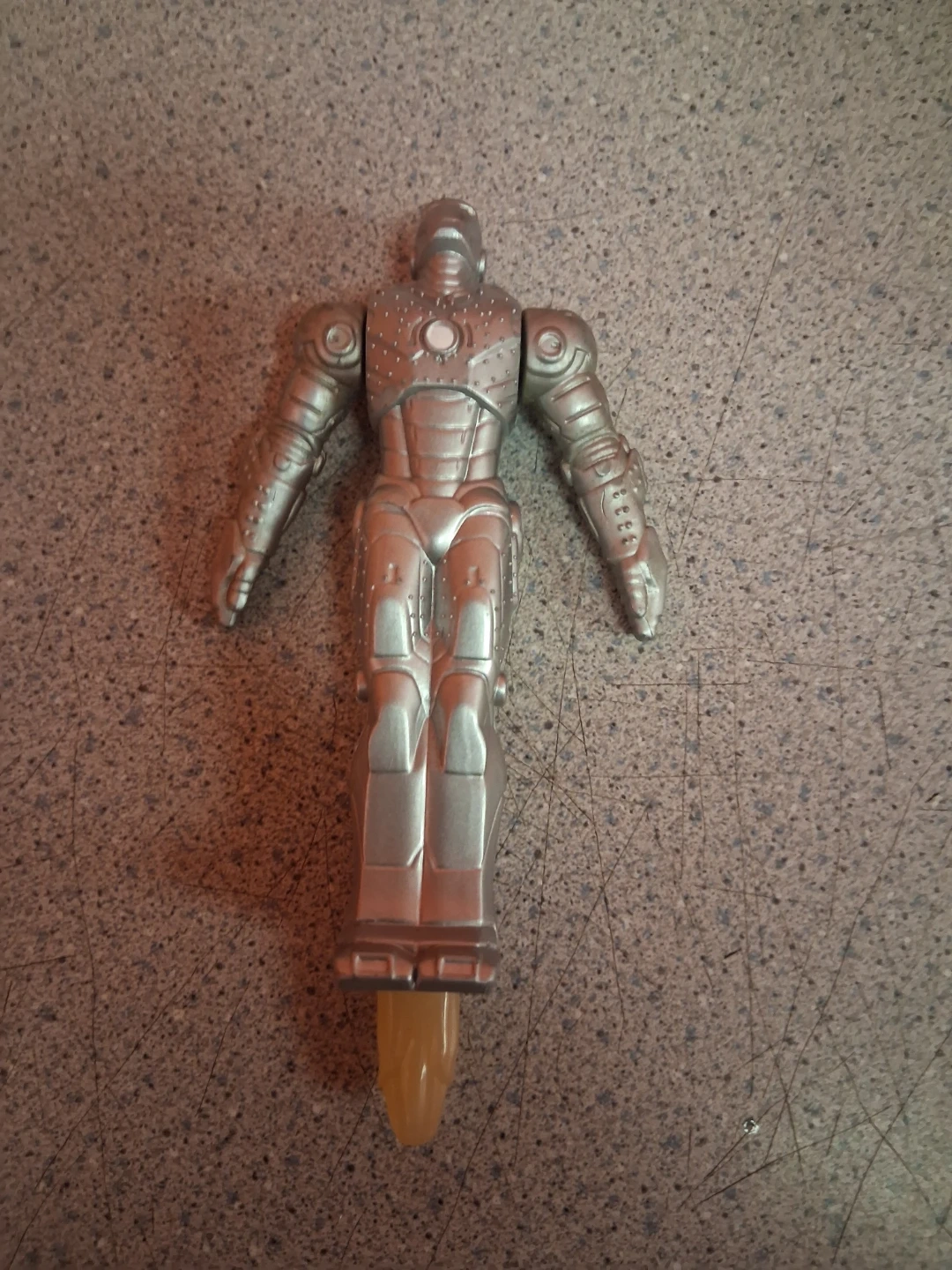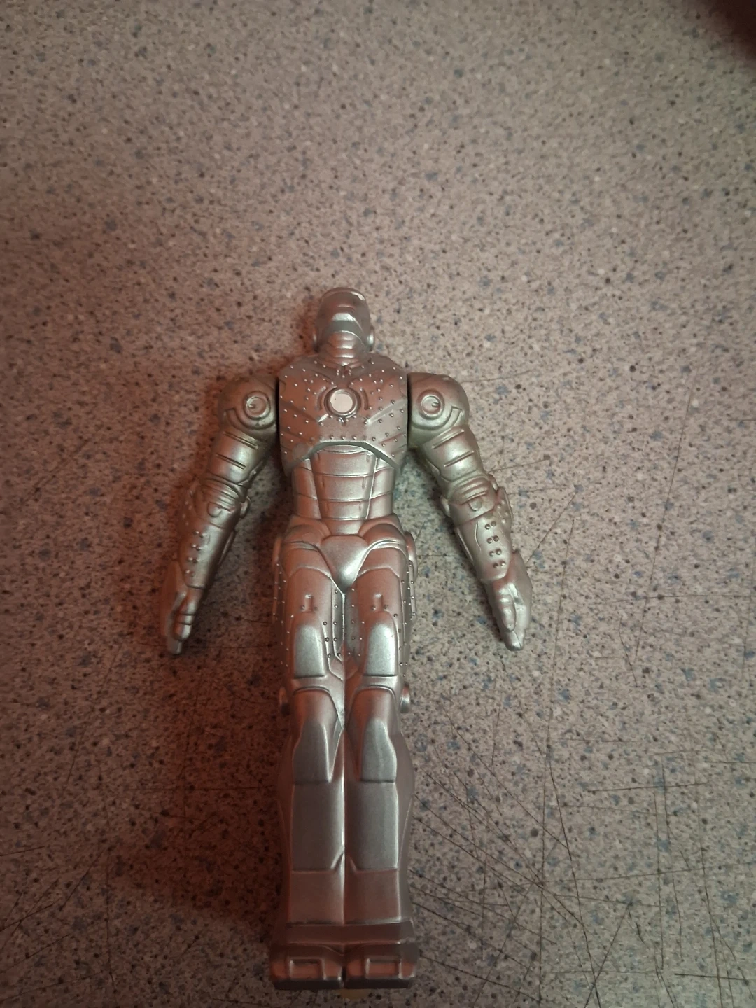 Selling an Iron Man action figure in silver color! It's in great condition and ready for a new home. Perfect for any Marvel fan or collector