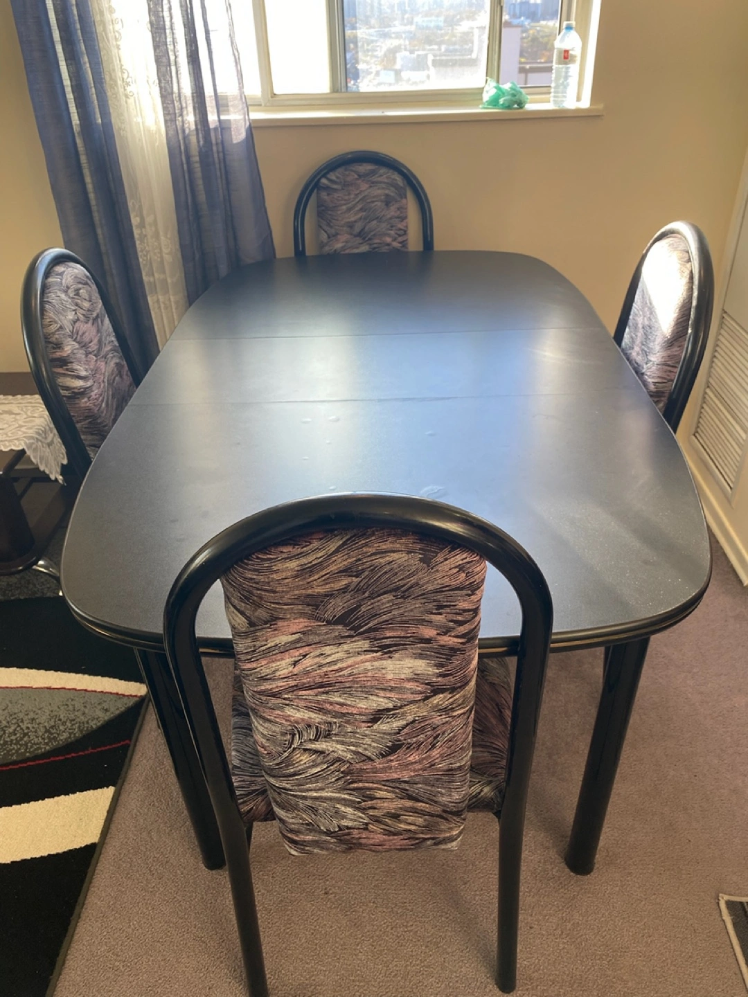 Four-chair dining set. Black table and chairs. Unique chair fabric design. Good condition.