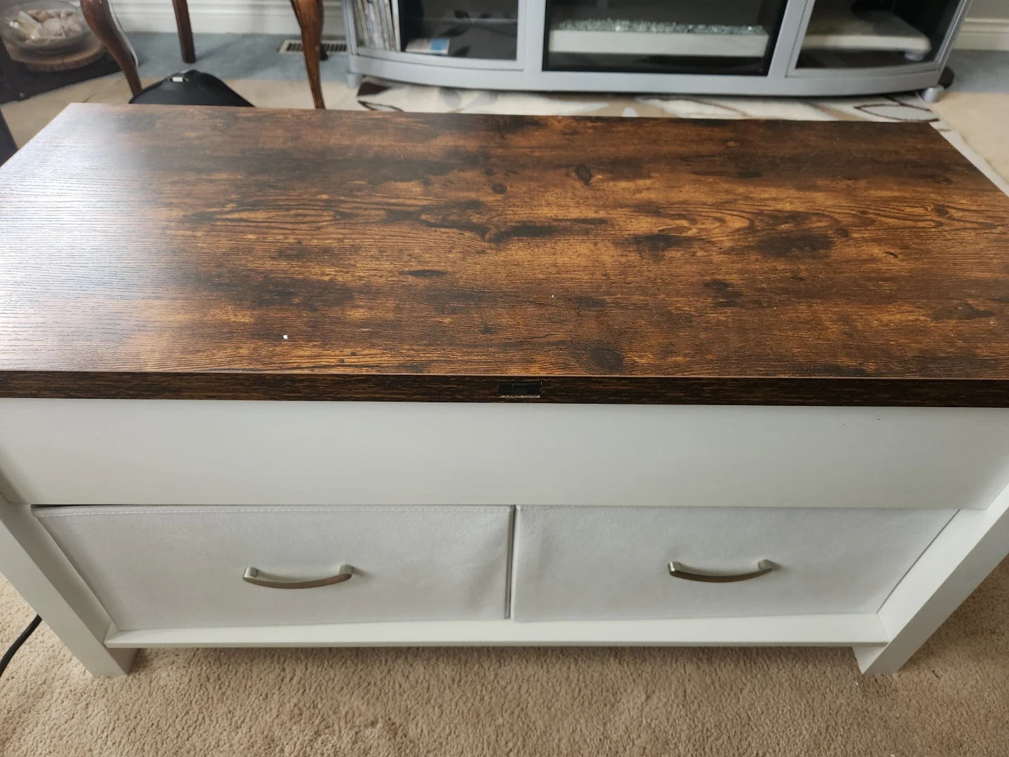 This lift top coffee table features a rustic wood finish and two fabric drawers for storage. It also includes built-in outlets for convenience. The lift mechanism makes it easy to adjust the height for working or dining. It's a functional piece for any living room!