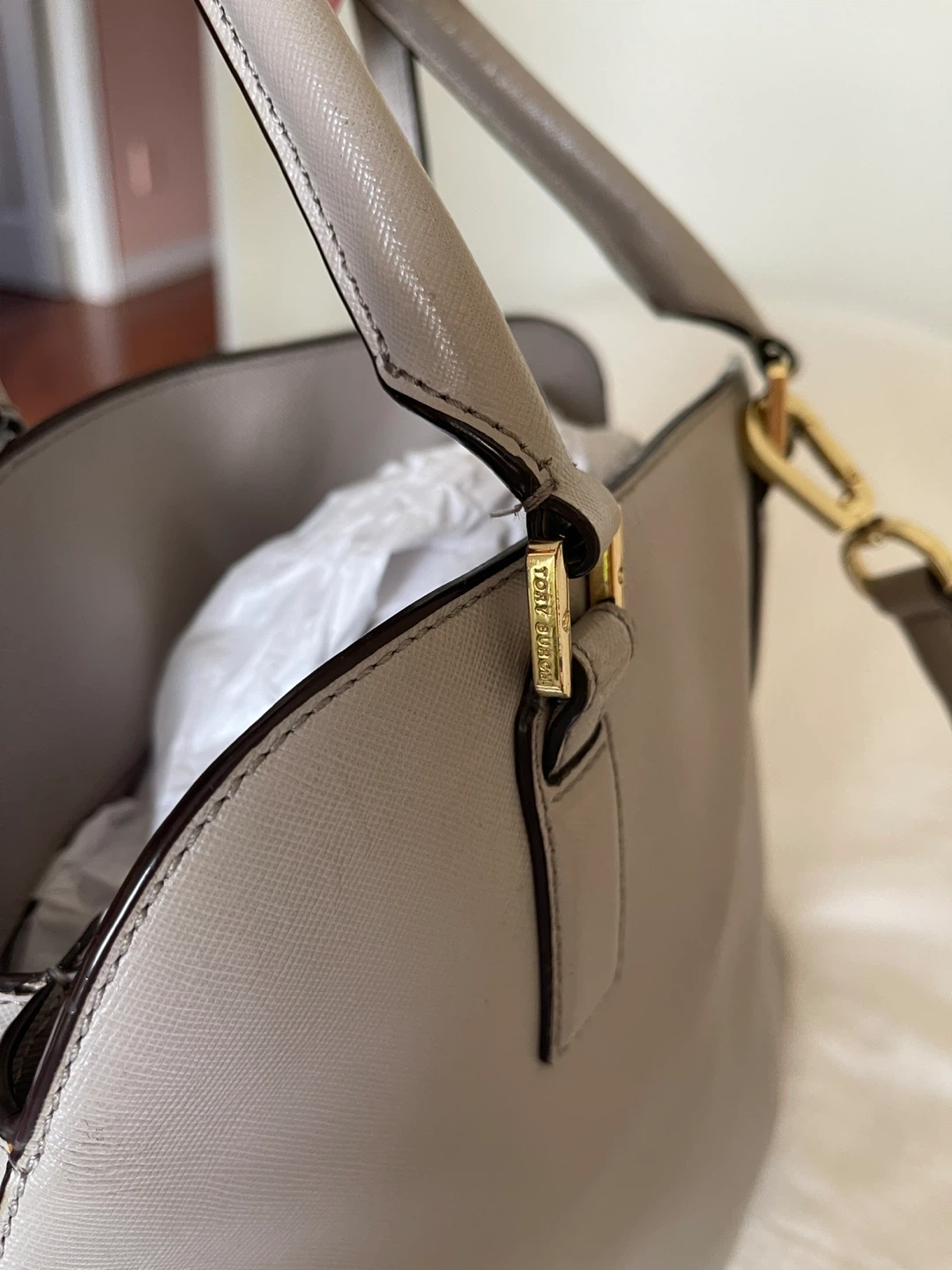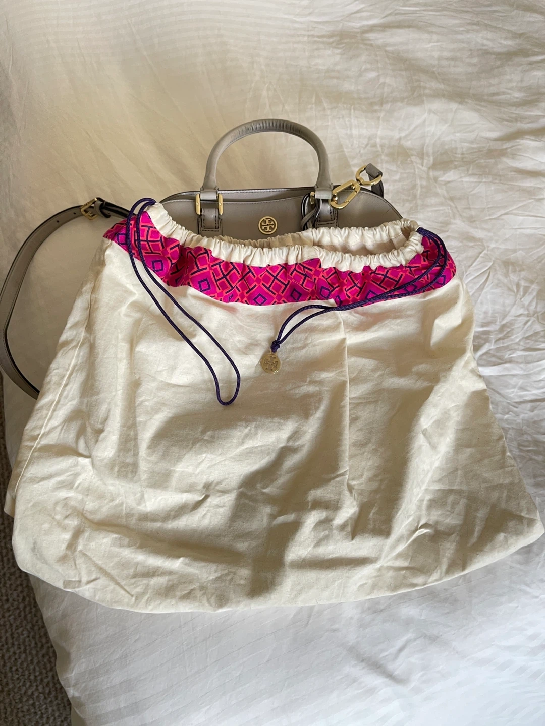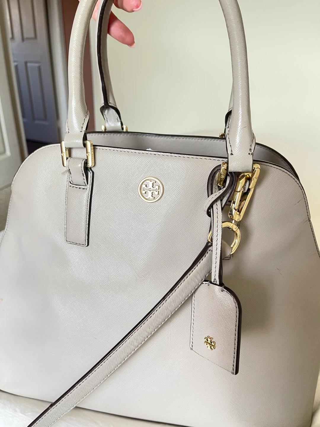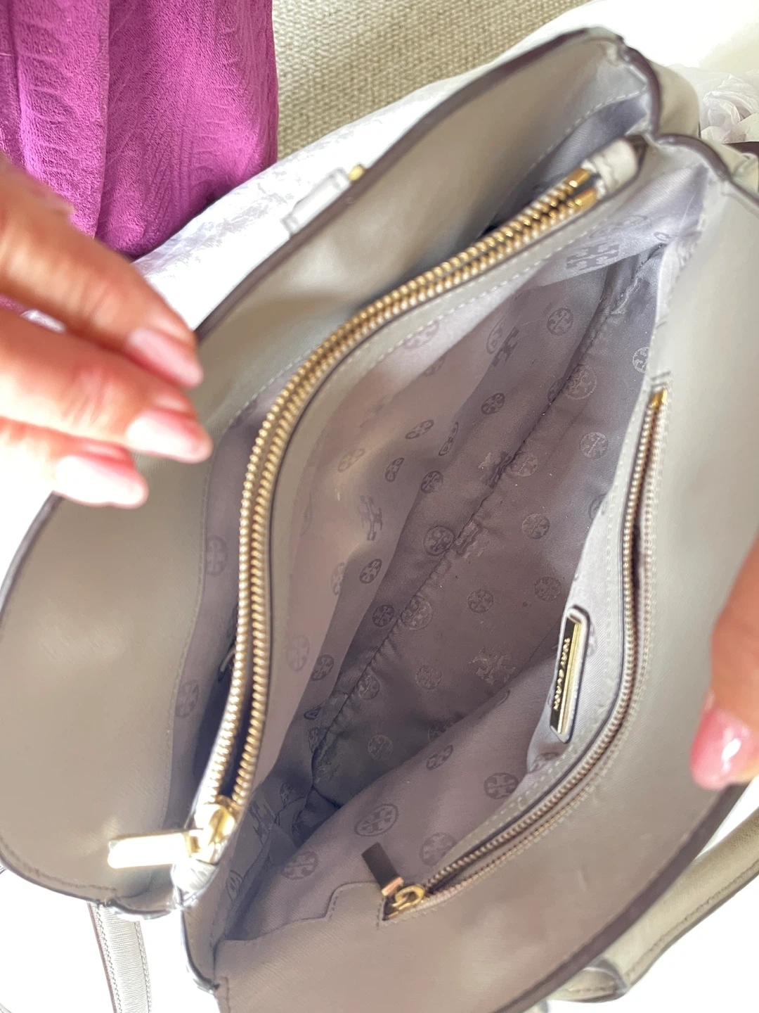 This is a Tory Burch satchel handbag. It's made of grey leather with gold hardware. The interior features a patterned lining and multiple pockets.