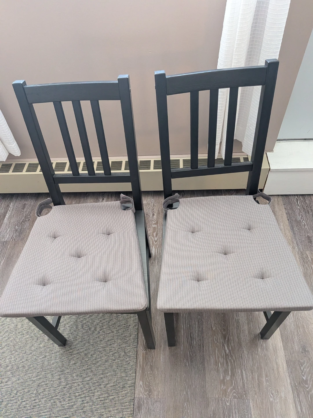 Two dark grey wooden dining chairs are available, each with a light grey striped seat cushion. The chairs are made of wood. These chairs are great for a kitchen or dining room.