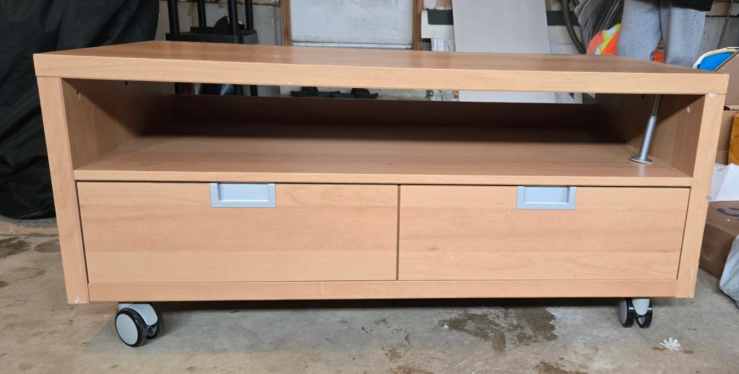 This is a light wood finish entertainment unit from IKEA. It features two drawers for storage and is on wheels for easy mobility. Its open shelf above the drawers is perfect for media consoles.