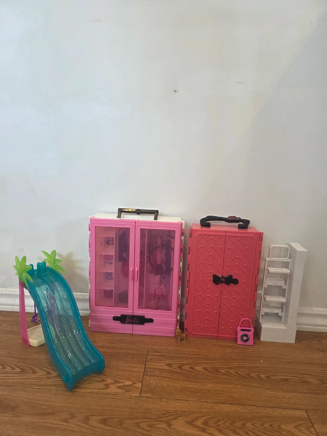 This Barbie doll wardrobe set includes two pink wardrobes, a blue slide, and a white staircase. It's great for organizing doll clothes and accessories. This playset is perfect for imaginative play!