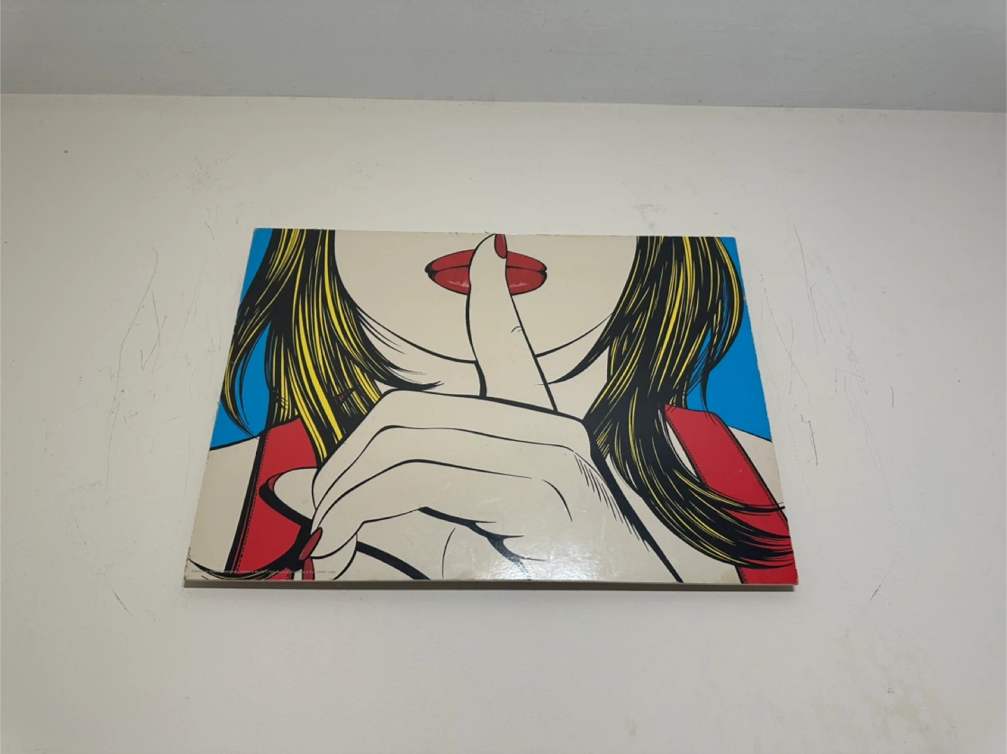 This is a print featuring a pop art style illustration of a woman with her finger to her lips. The artwork has bold colours and a graphic style. It's a great piece for adding a statement to any room.