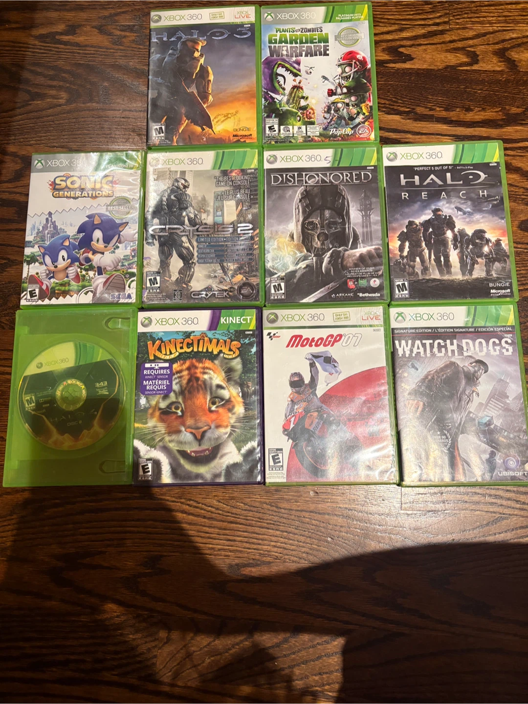 Includes Xbox 360 console with power brick and AV cables. Comes with two controllers and a selection of games: Halo 3, Plants vs. Zombies, Sonic Generations, Dishonored, Halo Reach, Kinetimals, MotoGP 07, and Watch Dogs. Can be purchased individually or as a lot. All games are tested and working if for whatever reason your game does not work I will accept refunds within 30 days GAMES: Crysis 2- $4 Dishonored-$5 Halo 3- $7 Halo 4 (loose)- $6 Halo reach- $7 Kinectimals-$5 MotoGP ‘07-$7 Plants vs zombies garden warfare-$5 Sonic Generations- $10 Watchdogs-$7 PGR 3(ART AND MANUAL ONLY)-$3 Xbox 360 with 2 controllers and cables- $90 If buying as a lot- $150