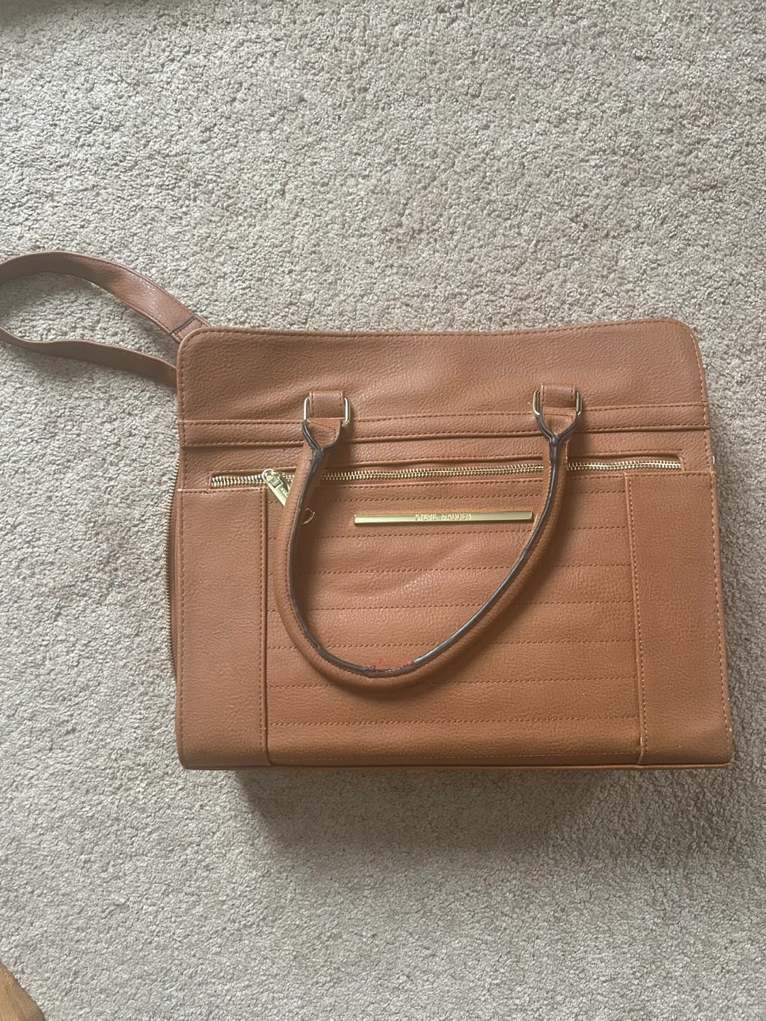 Brown faux leather satchel handbag by Steve Madden. It's a versatile size for everyday use. Features a top zip closure and exterior zip pockets.