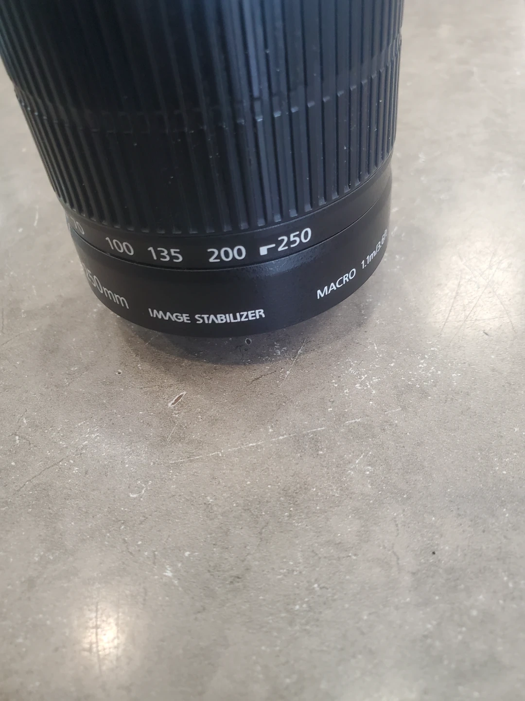 Canon EFS 55-250mm image stabilizer lens. Aperture range 1:4-5.6. Macro focusing distance is 1.1m/3.6ft. This lens is great for capturing sharp images from a distance!