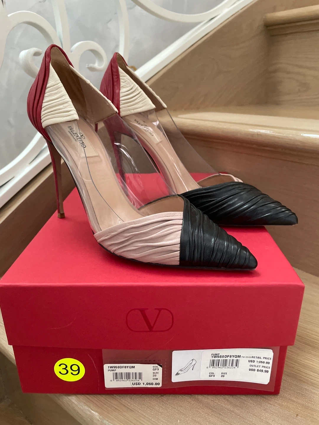 These are Valentino heels in size 38.1/2 They feature a mix of red, white, and black leather with clear PVC accents. Made in Italy. Original price $ 980.00