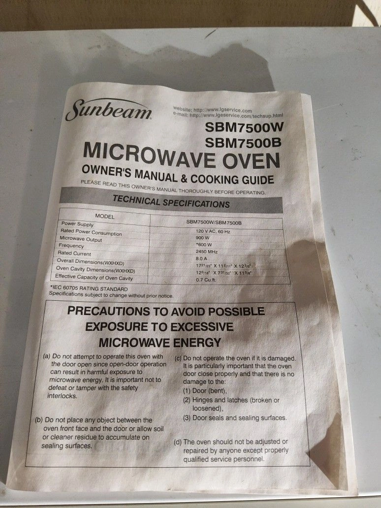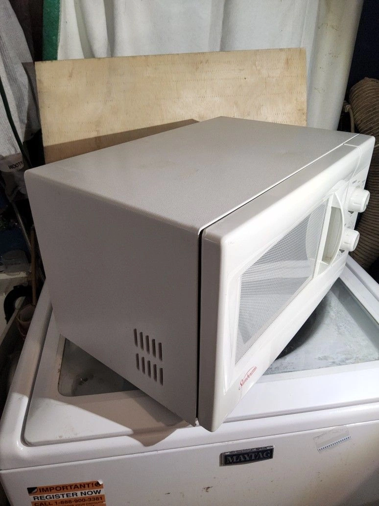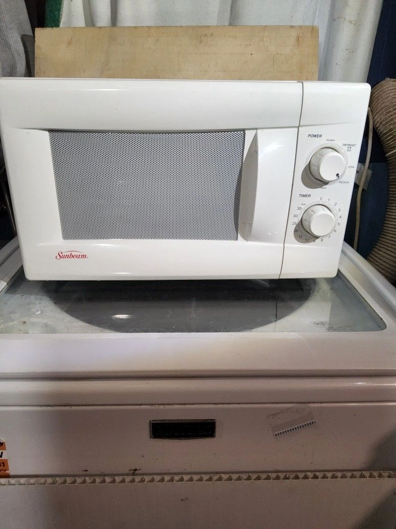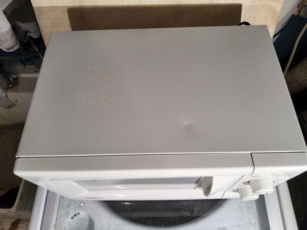 Nice working Sunbeam microwave, name brand, in great shape. Vintage, appears unused from storage. This quality appliance will last for years. Originally sold for $150. 7-day warranty included. Can show it operating at the time of purchase if you'd like. The microwave oven features six pre-set cooking options and ten different power levels for precise heating or defrosting. It also has an easy-to-read digital LED display clock and timer.