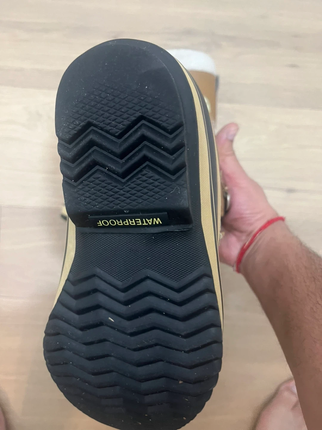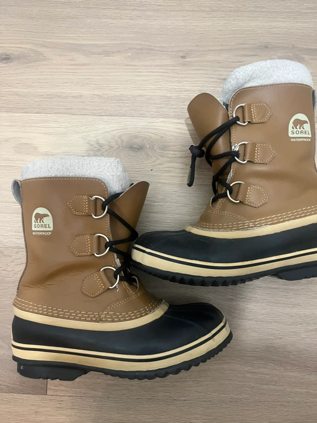 Brown and black Sorel winter boots with a fuzzy lining. They're waterproof and insulated for warmth. Great for keeping feet dry and toasty in the snow!
