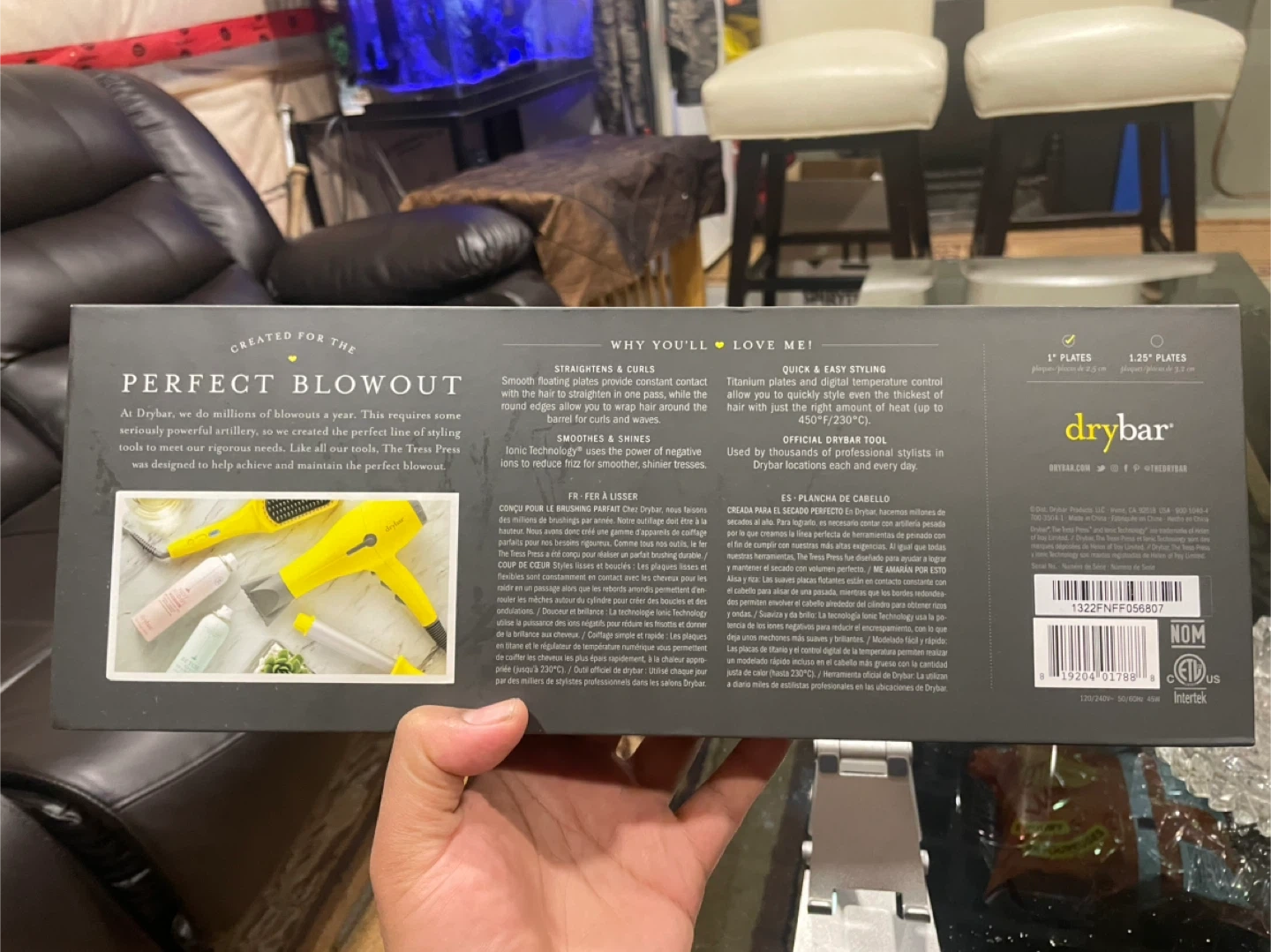 This is the Drybar The Tress Press straightening iron. It features 1" titanium plates with digital temperature control up to 450°F/230°C. It's designed for smoothing and straightening hair.