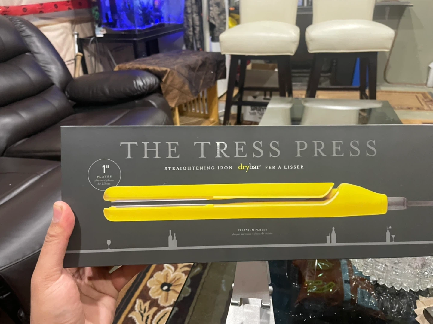 This is the Drybar The Tress Press straightening iron. It features 1" titanium plates with digital temperature control up to 450°F/230°C. It's designed for smoothing and straightening hair.