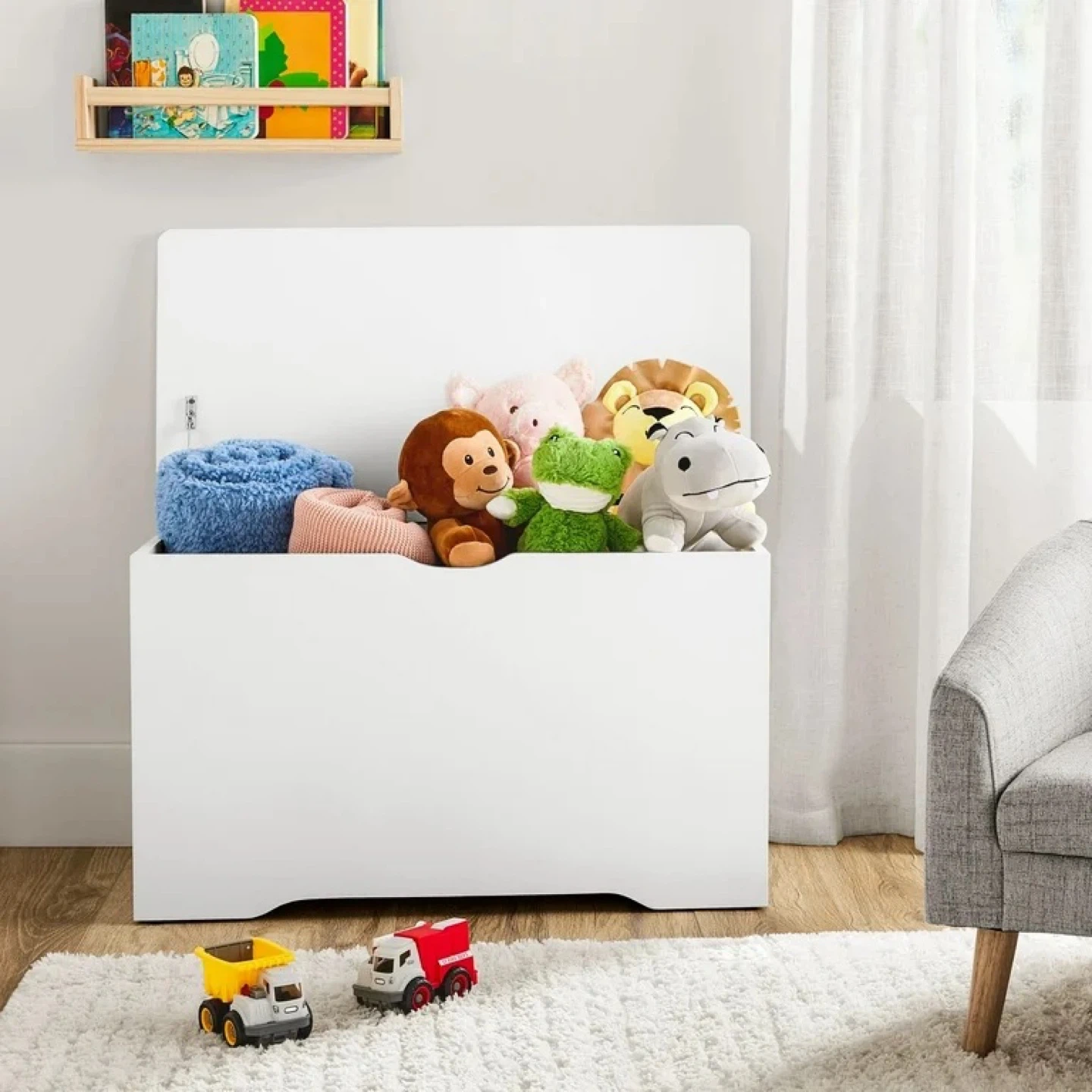 * Safety Features: Designed with a slow-close safety hinged lid for smooth, quiet operation, and rounded corners with smooth edges to ensure child safety.