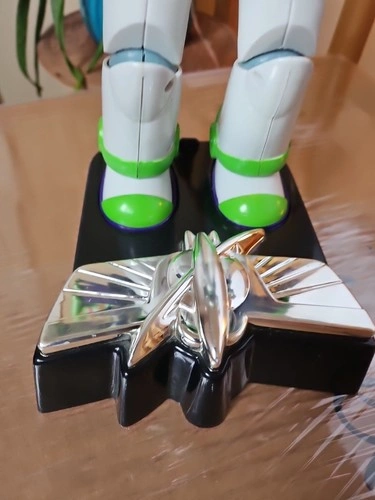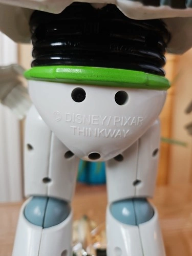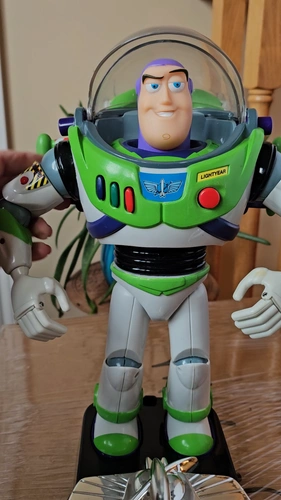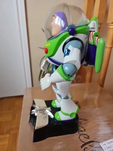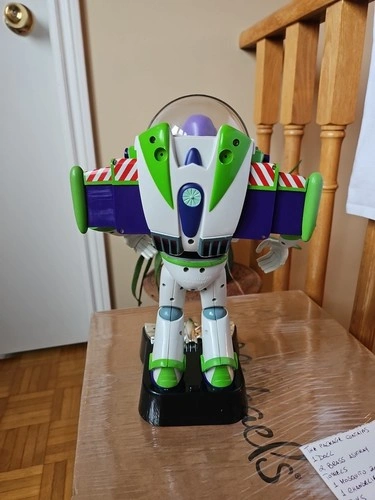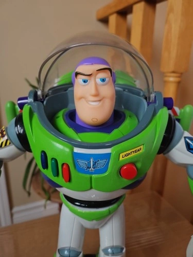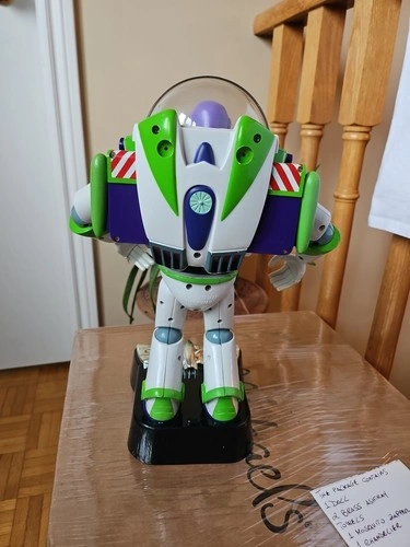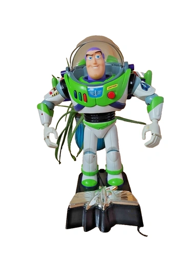This is a vintage 1990s Disney Pixar Thinkway Toys Buzz Lightyear action figure from Toy Story. It's a 12-inch tall collectible space ranger in his signature outfit. Made of durable plastic, this figure was manufactured between 1990 and 1999. It features a light-up function (batteries required) and a talking function with Tim Allen's voice. This is an original, uncustomized representation of the character. It does not come with the original packaging. Let me know if you're interested!