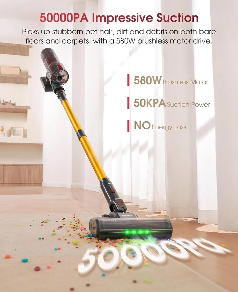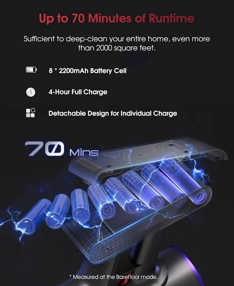 Pick up and Cash Only. Features: Siphon Feature, 1.6L Dust Cup, 45 dB Low Noise, 7.3 lbs Lightweight, 3 Multi-Function Tools, 48KPa Turbo Suction, 550W Brushless Motor, Max 65mins Runtime, 7 Multi-layer Filter, User-Friendly LED Display, V-Shaped Anti-Tangle Roller Brush. Auto-Boost: Guarantees a thorough clean of airduct, UV5 will have auto-boost suction for 3 seconds when turning off in hardfloor mode. 580W Brushless Motor & 50KPA Ultra-Strong Suction: Effortlessly picks up debris from floor gaps, pet hair, and litter from carpets and sofas. 70-Minute Long Battery Life: Cleans up to a 2,500-square-foot house on a single charge. Detachable battery design. Tangle-Free Roller Brush & LED Headlight: V-shaped roller brush reduces hair tangling by 95%. Four LED headlights on the floor brush. LED Touch Screen User Friendly & Efficient Filtration: Switch between Bare floor, Carpet and Turbo mode. Displays real-time information like battery life and suction mode. 7-stage filtration system. Self-Standing Multi-Functional Vacuum Cleaner: Can stand on its own. Adjustable telescopic rod and included multi-functional brush head for various cleaning scenarios. Instant switching to handheld mode.