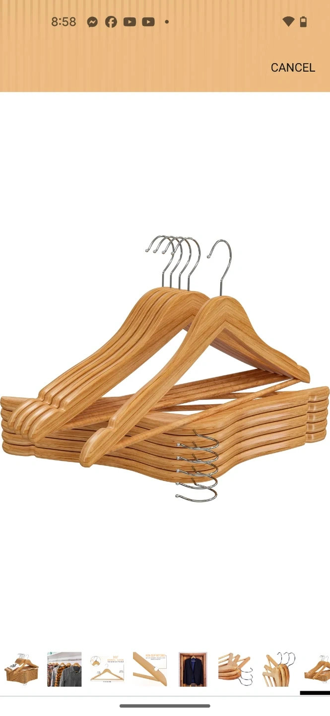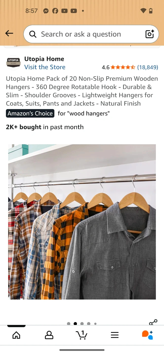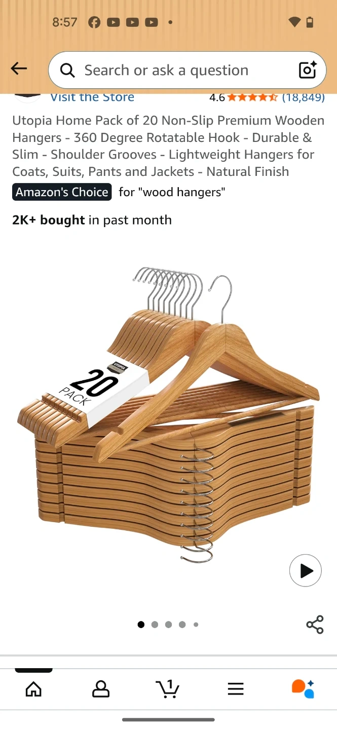 This is a 20-pack of Utopia Home premium wooden hangers. They feature 360-degree rotatable hooks and non-slip notches. Each hanger measures 17.5 inches in length and 0.5 inches in width.