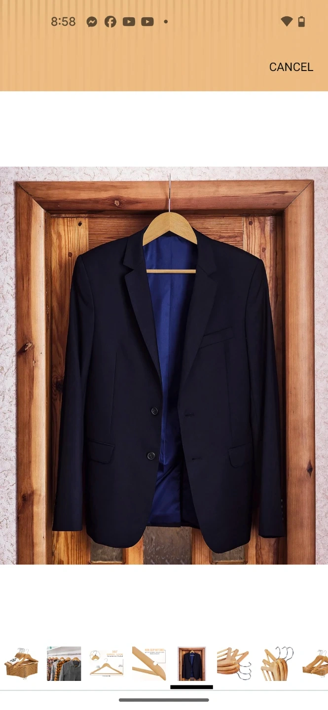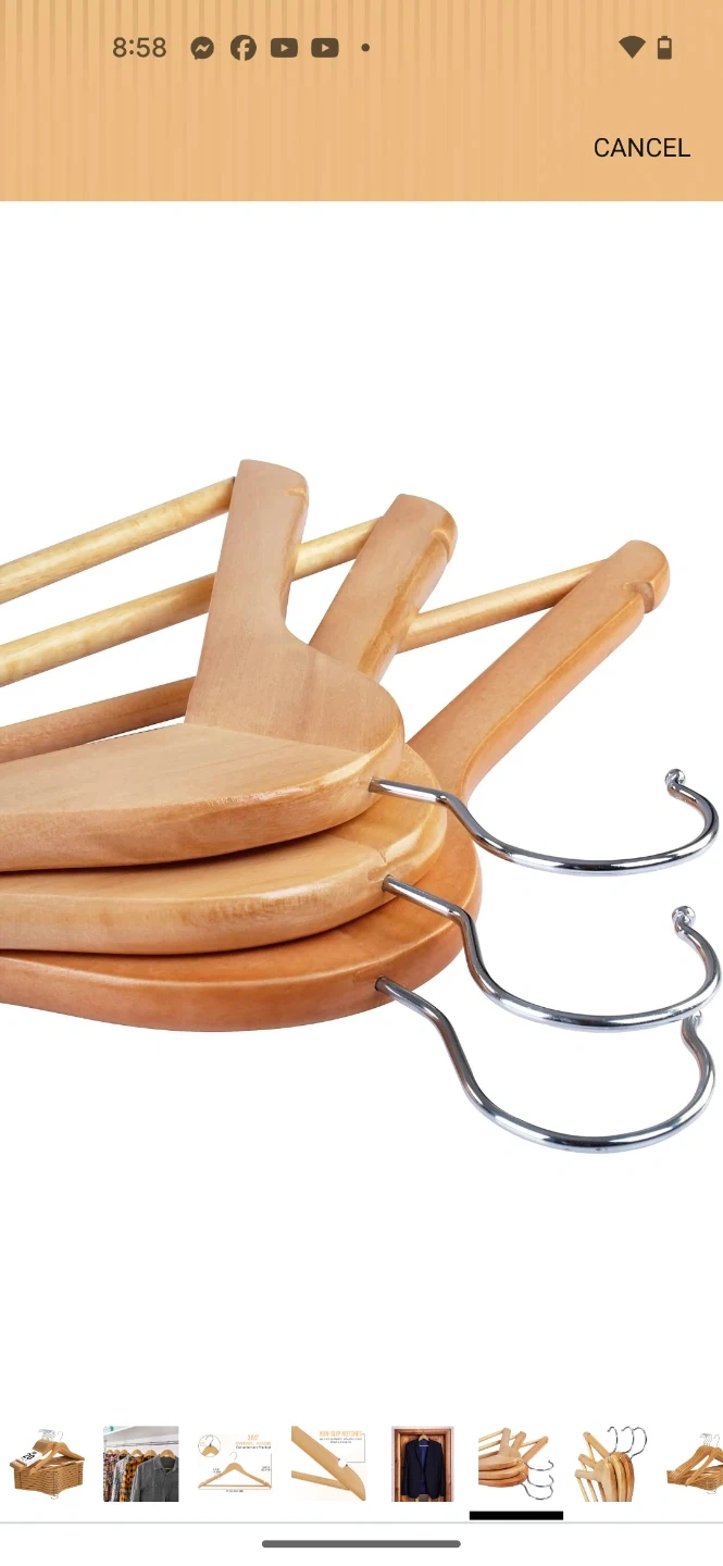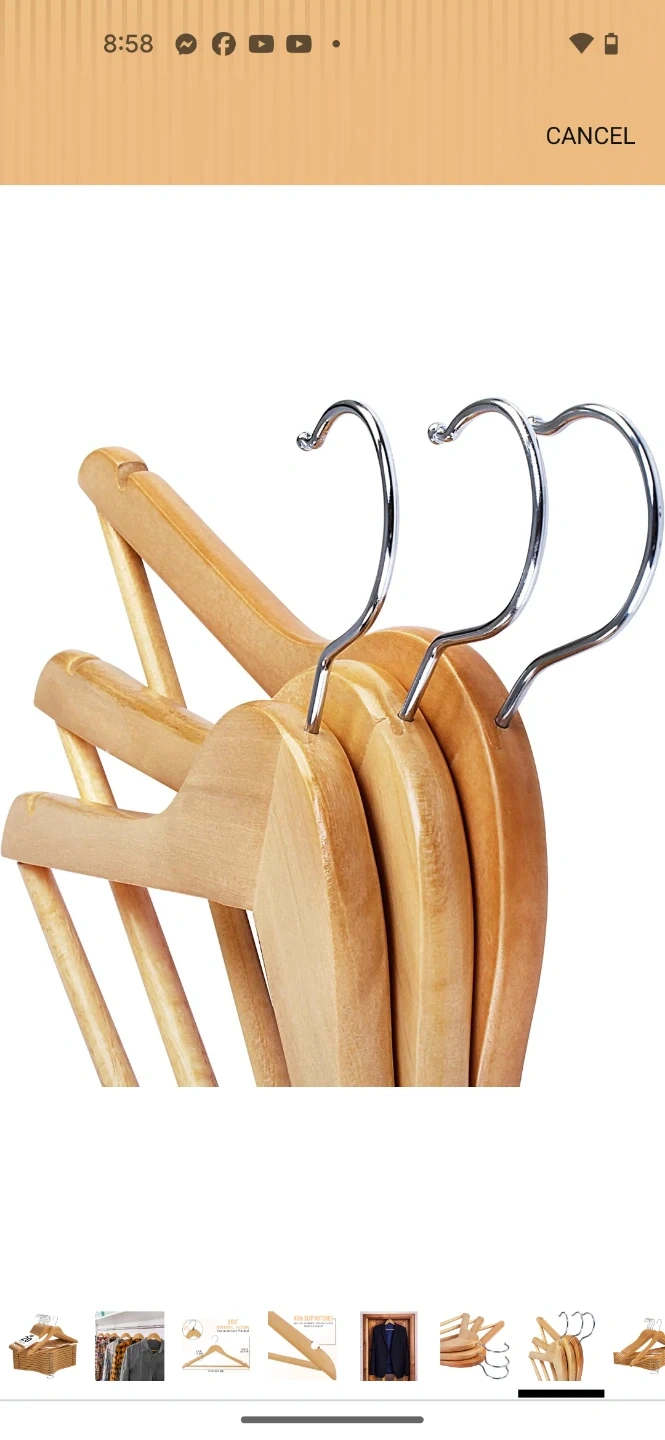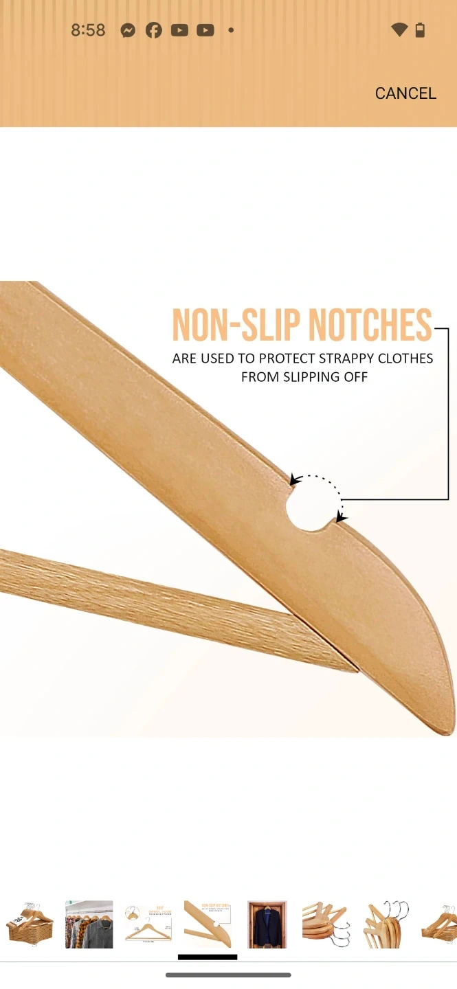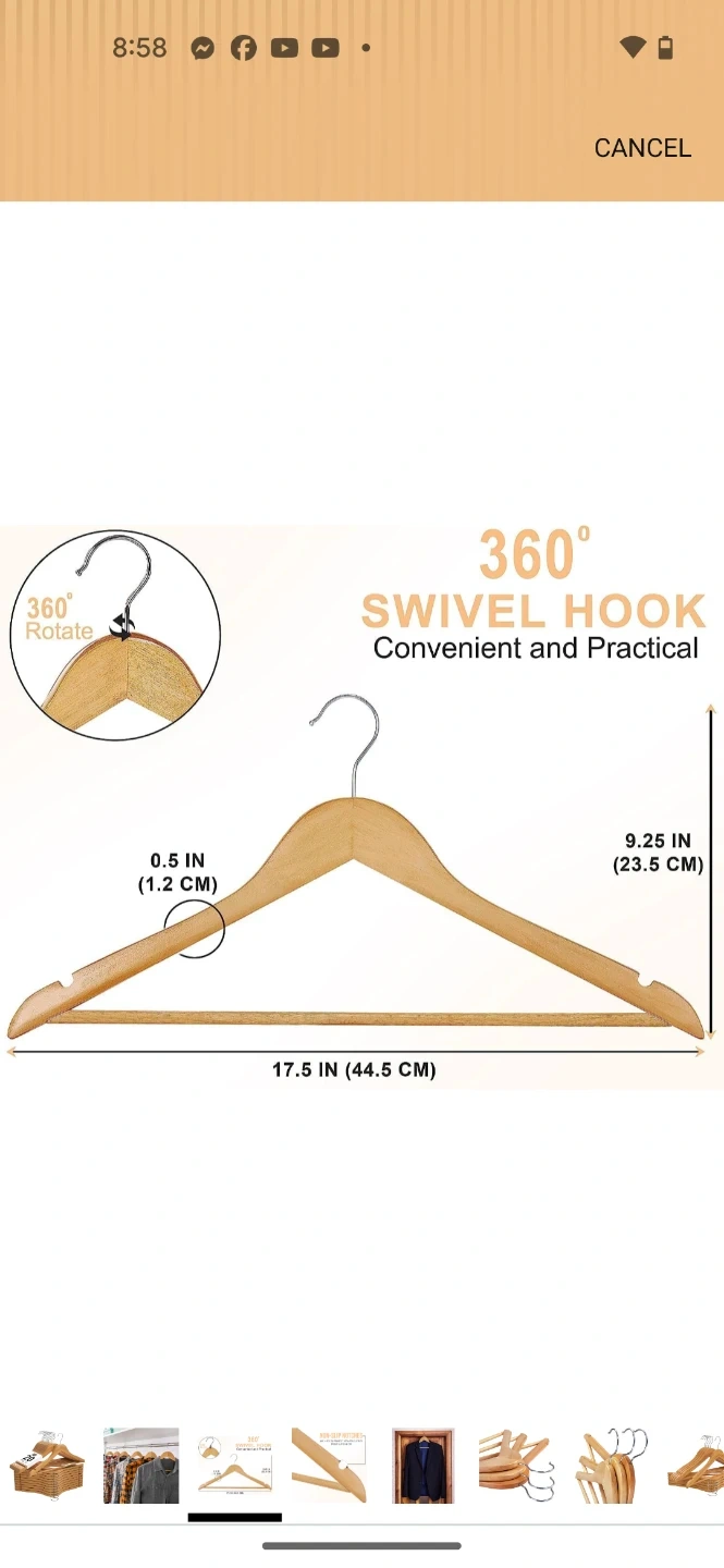 This is a 20-pack of Utopia Home premium wooden hangers. They feature 360-degree rotatable hooks and non-slip notches. Each hanger measures 17.5 inches in length and 0.5 inches in width.