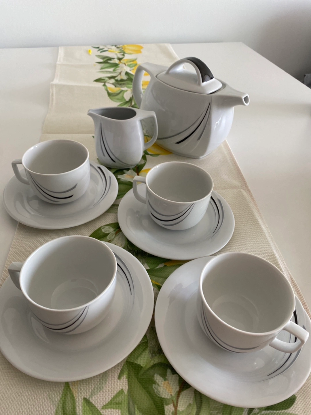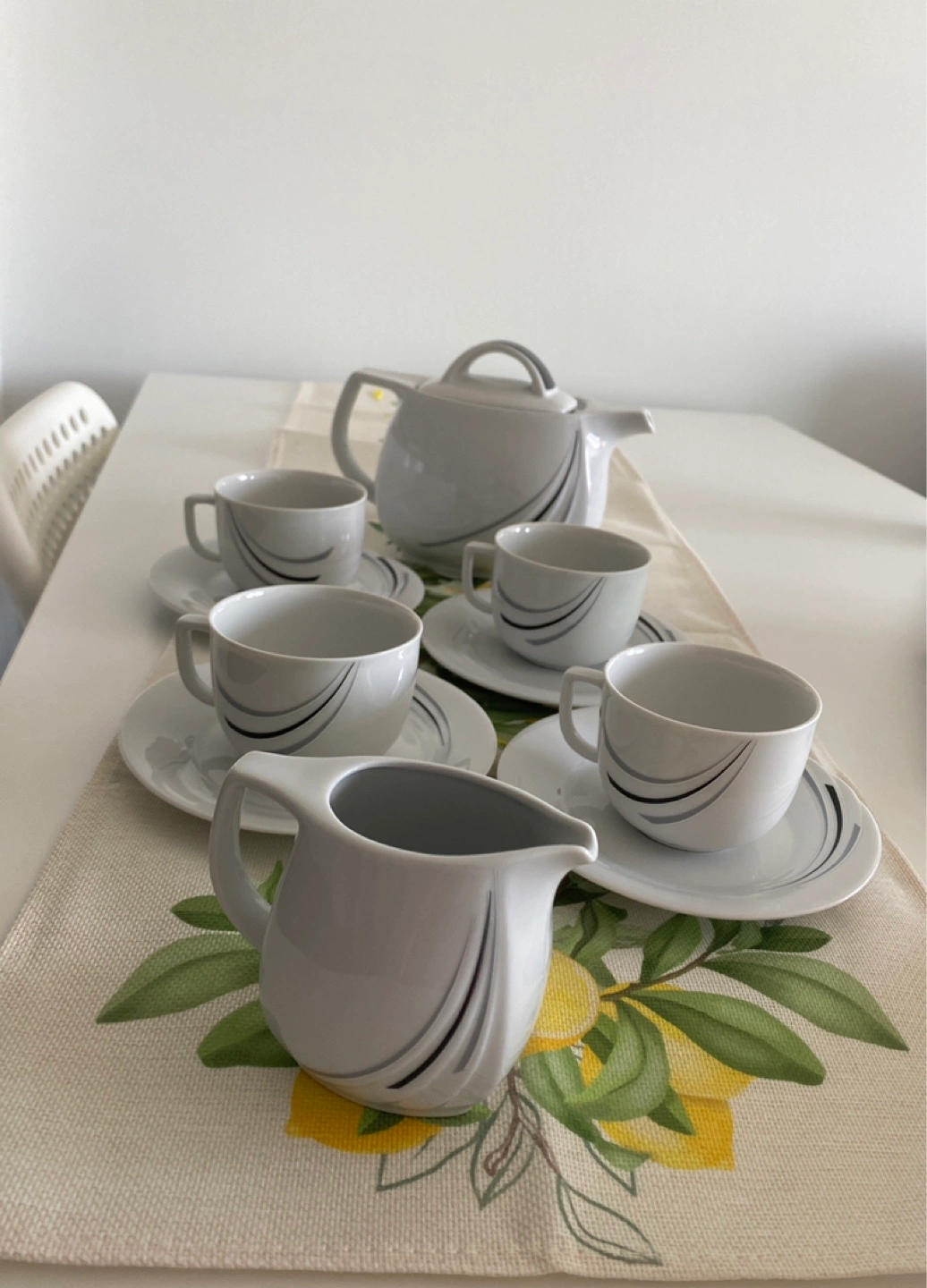 Selling a lovely tea set that includes a teapot, creamer, and five cups with saucers. The set is white with a simple grey line design. Perfect for afternoon tea or adding a touch of elegance to your kitchen!