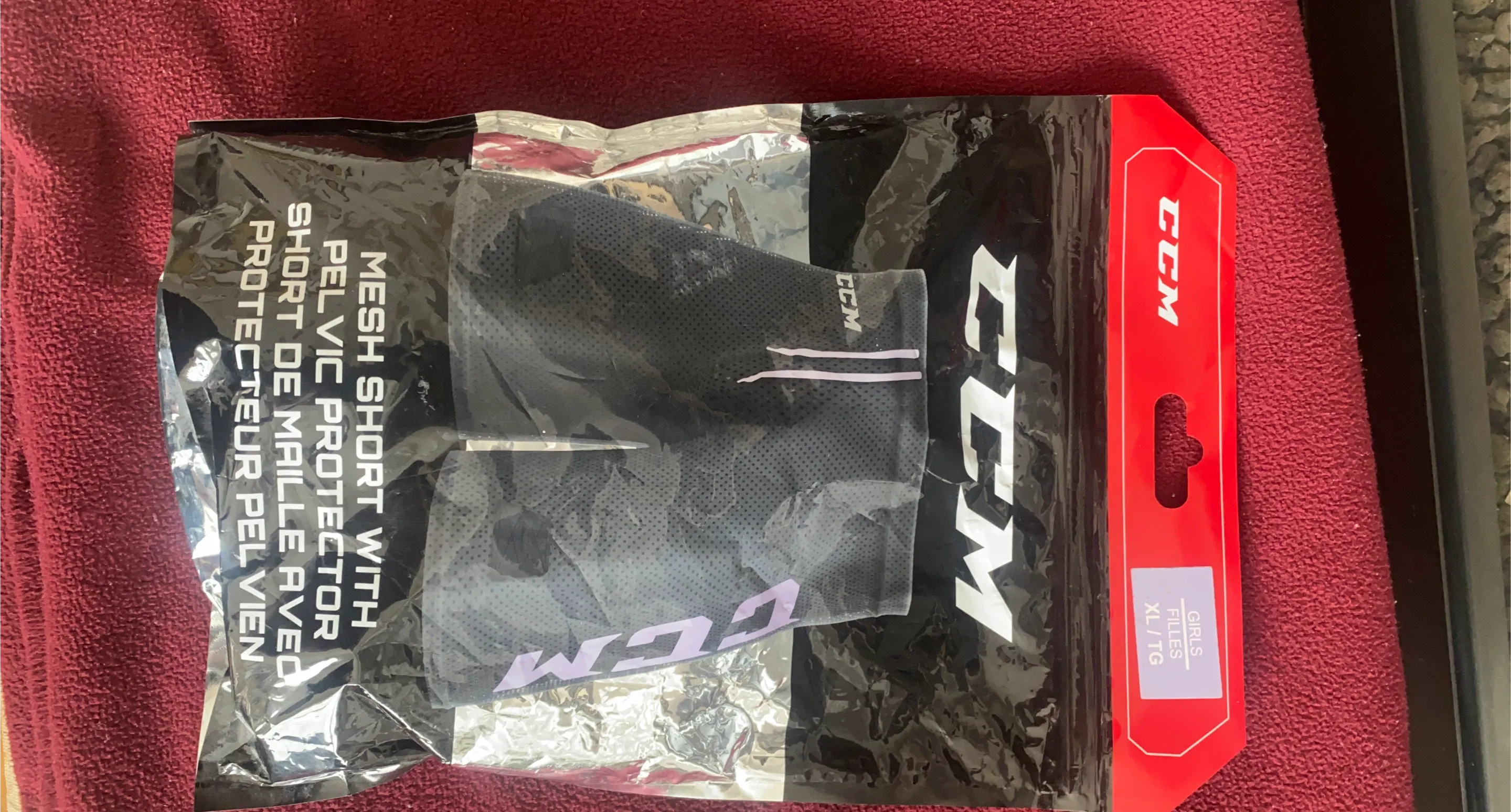 CCM mesh short with a pelvic protector. It's designed for girls and comes in size XL/TG. This item is new in packaging.