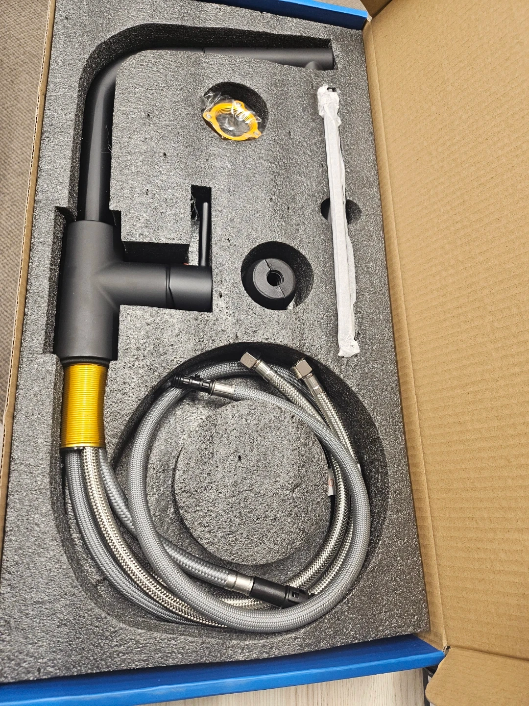 This is a new BRISA kitchen faucet in a sleek black finish. It features a pull-down sprayer for convenience. Includes all necessary hoses and mounting hardware for installation. Perfect for upgrading your kitchen sink!