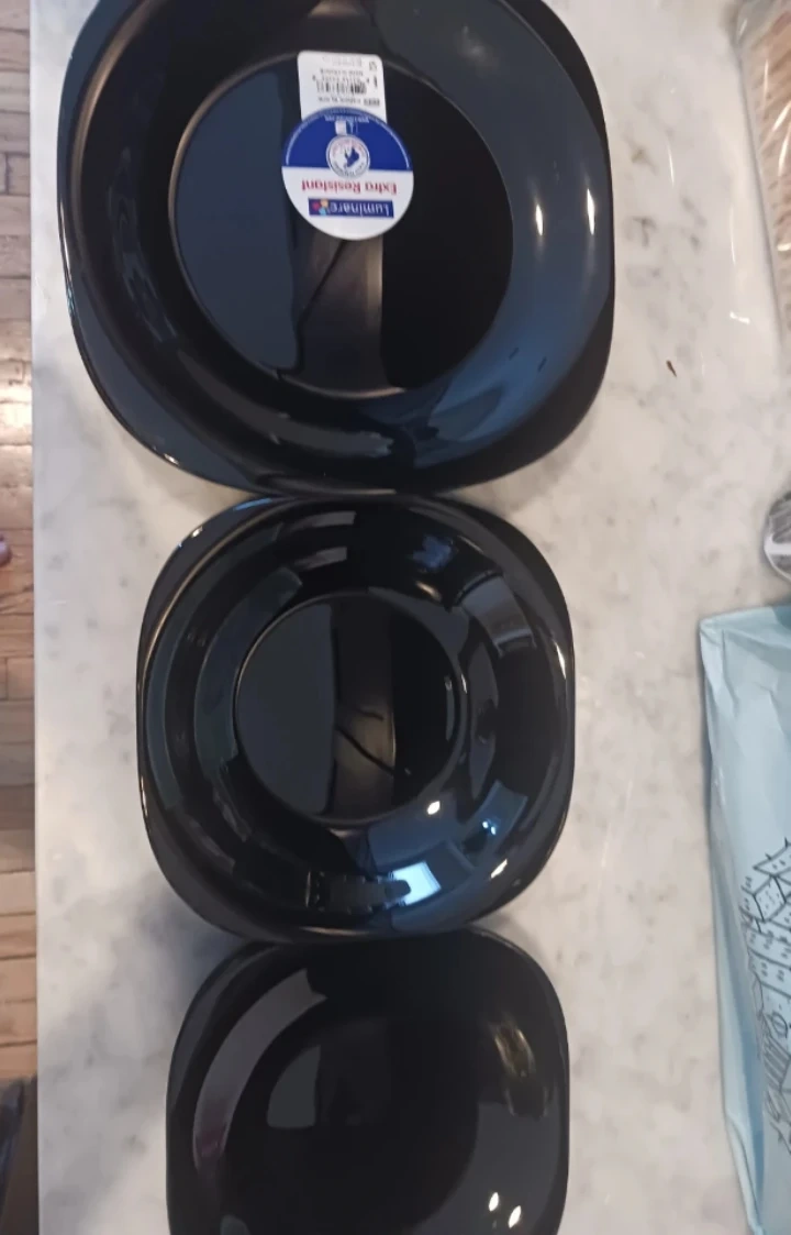 Set of Luminare black plates. They're extra resistant and have a sleek, modern design. Dishwasher and microwave safe!