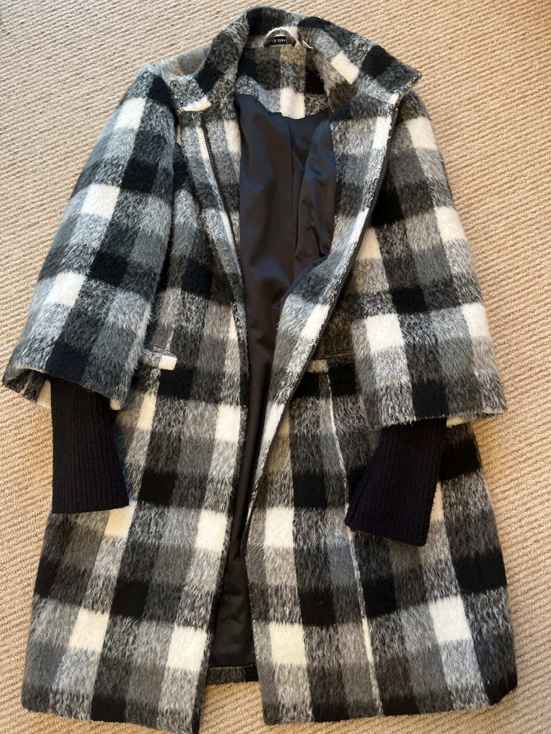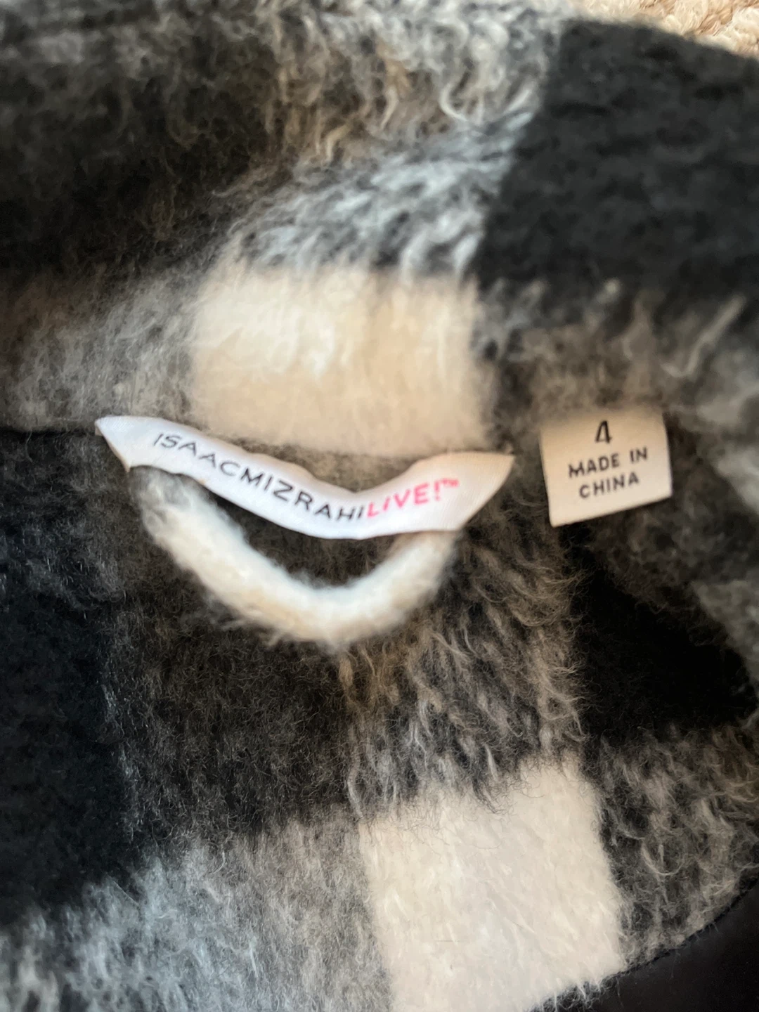 Cozy and stylish Isaac Mizrahi Live! coat in a classic black and white plaid pattern! It's a size 4 and perfect for adding a touch of sophistication to your wardrobe. The material is soft and warm, ideal for those chilly Canadian days! It's in great condition and ready for a new home
