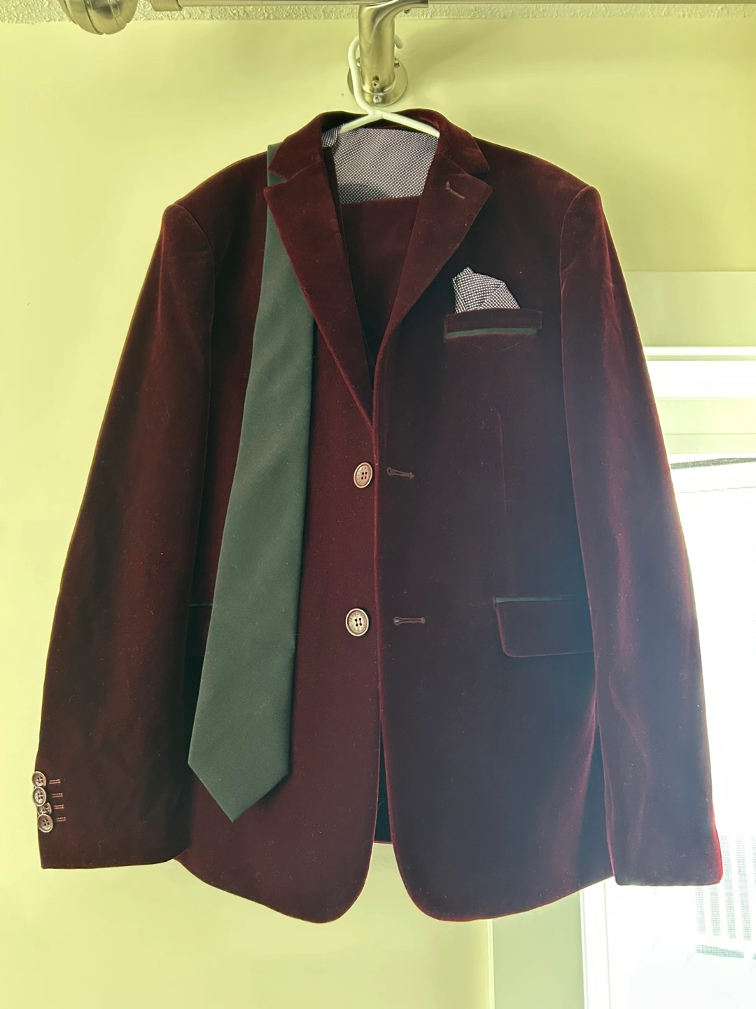 68Selling an Isaac Mizrahi velvet blazer in a rich burgundy colour. It's a boy’s age 12- 14 years and comes with a matching tie and pocket square , as well as a vest and dress pants. The pants also have an adjustable waist.