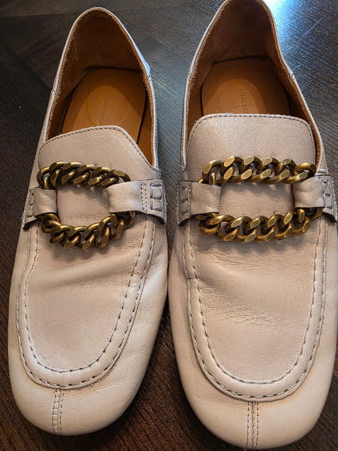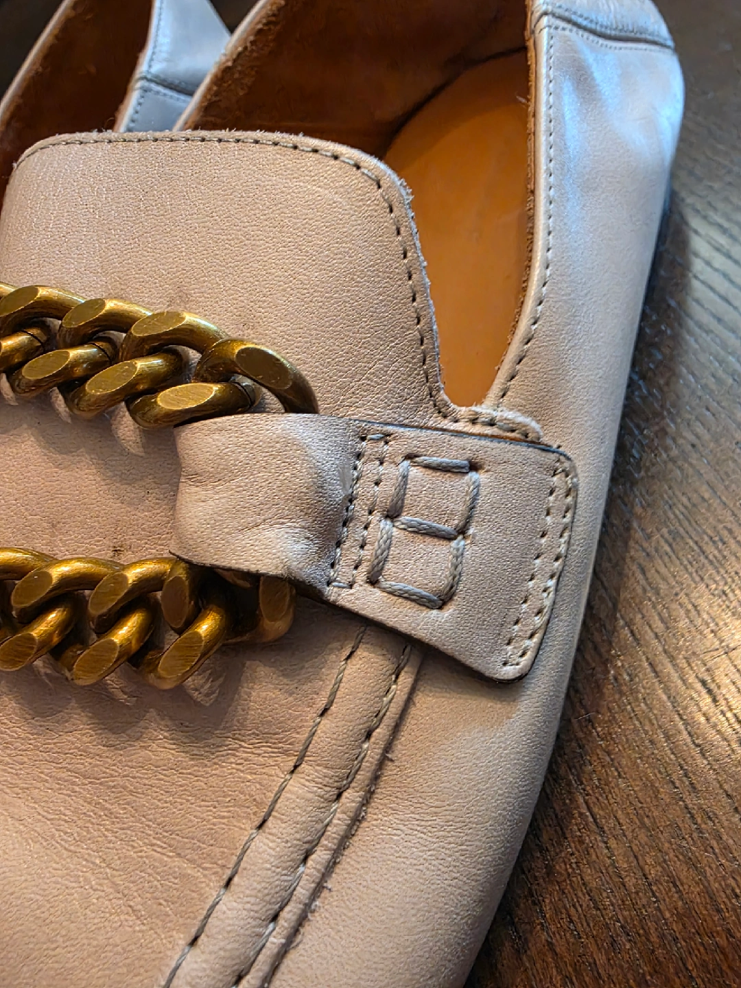 14Chain trims Collapsible heel Almond toe Slight heel Slip on Leather sole Made in Italy 100% Calf-skin leather Pick up Dawes Road and Danforth area Please see my other ads