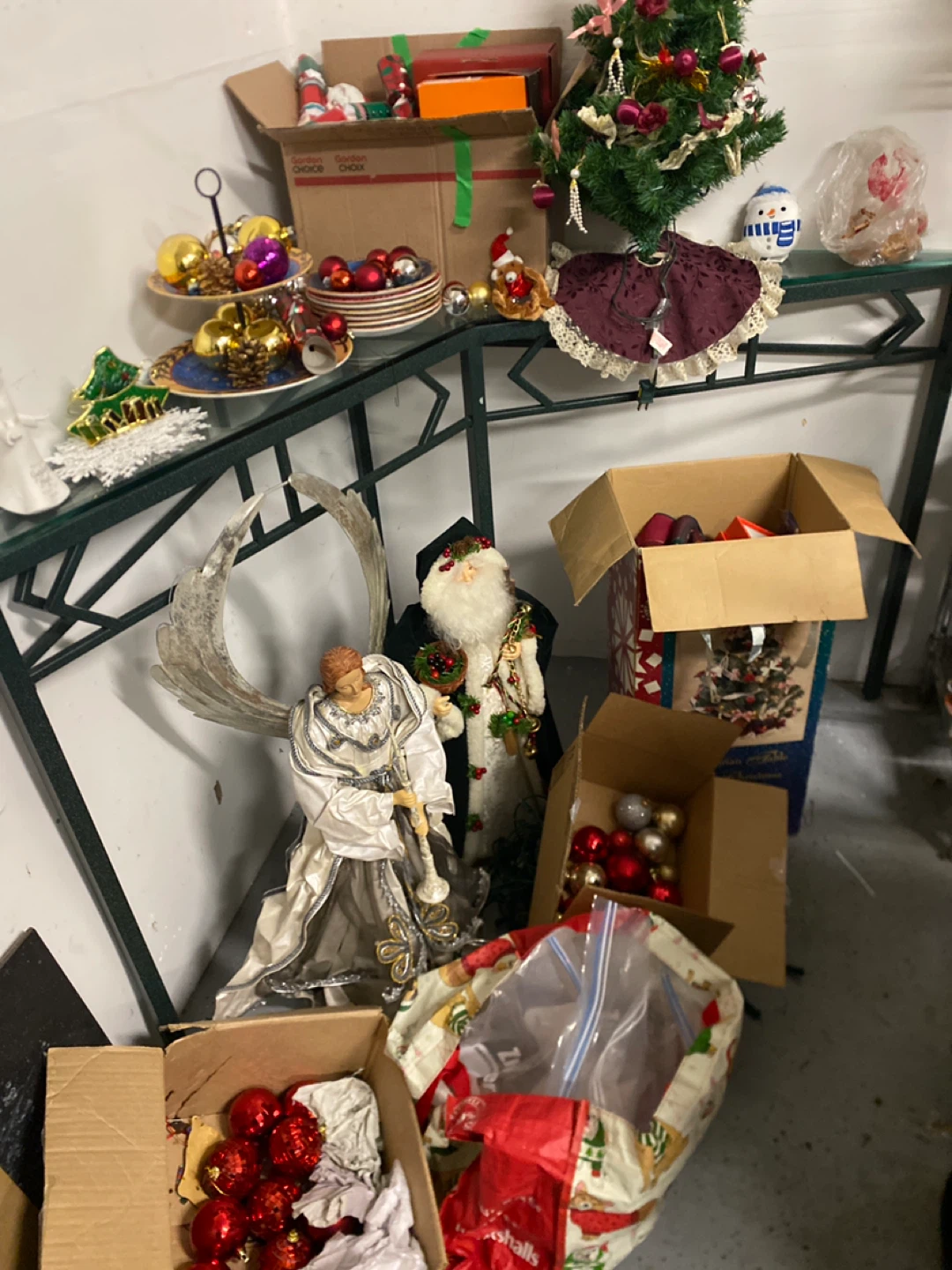 There is lots in the large box ! Selling a variety of Christmas ornaments and decorations. There are multiple boxes full of different items, including ornaments, figurines, and other festive decorations. Perfect for getting a head start on decorating for the holidays!