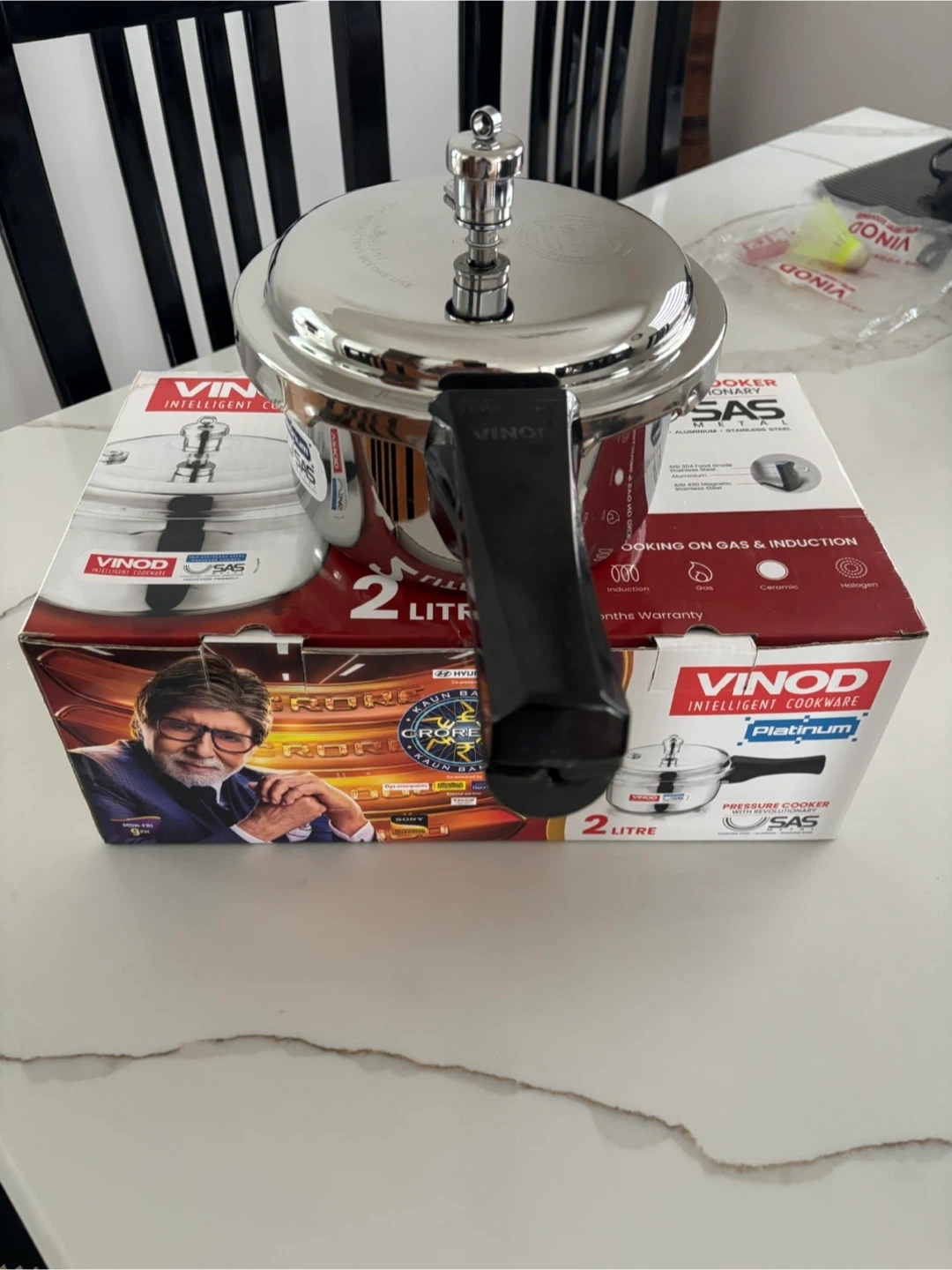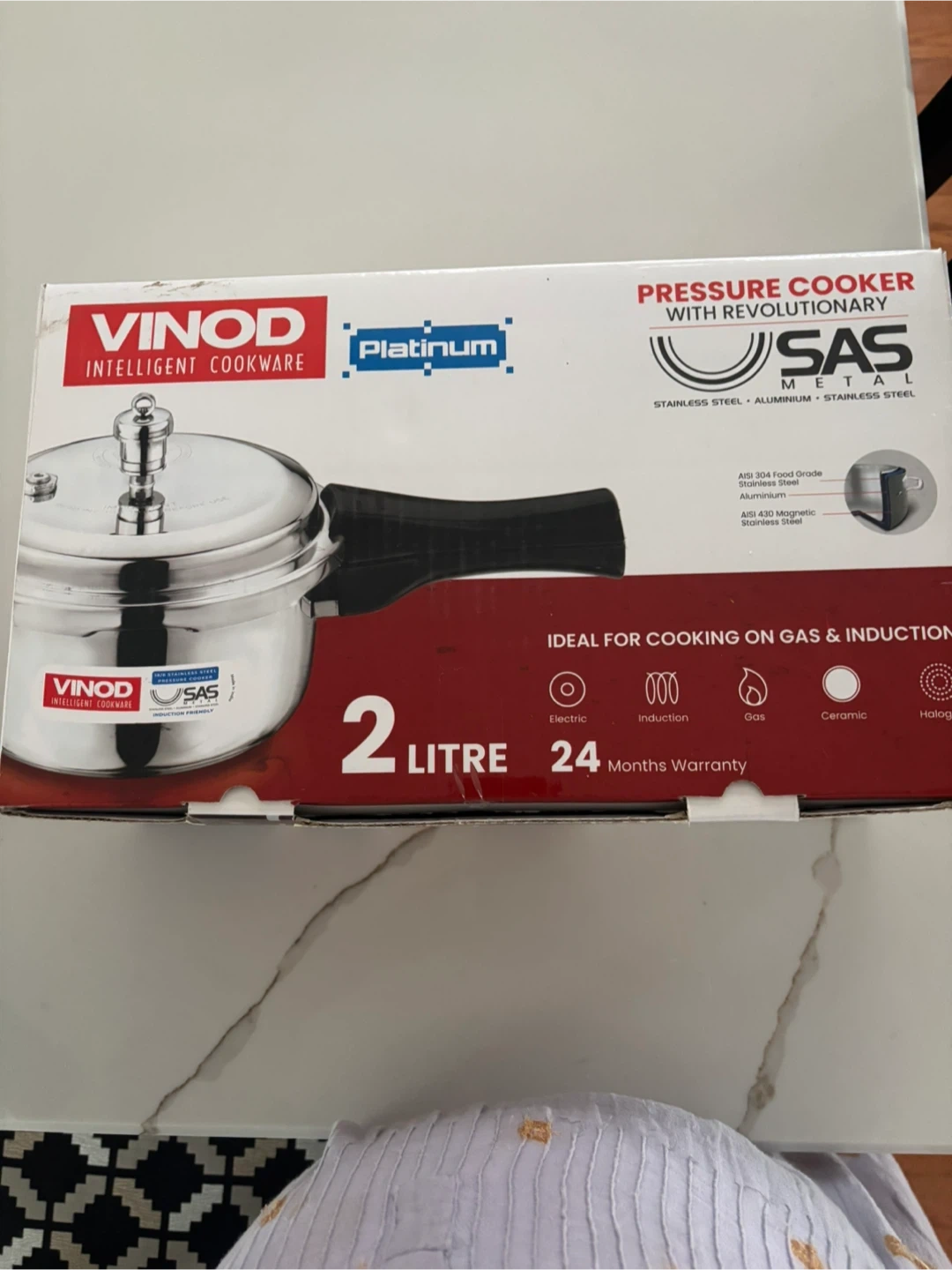 Vinod Platinum pressure cooker, 2 litre capacity. Made from heavy-duty stainless steel. Ideal for electric, induction, gas, ceramic, and halogen cooktops.