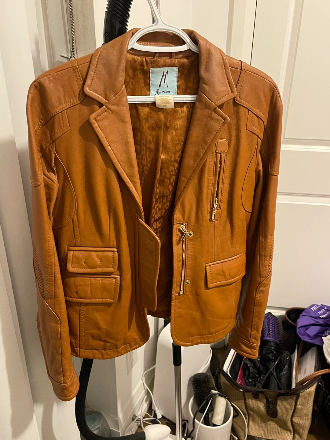 Stylish Guess by Marciano blazer made from genuine leather. It's a size medium with a unique leopard print lining. Perfect for layering over outfits for a chic look!