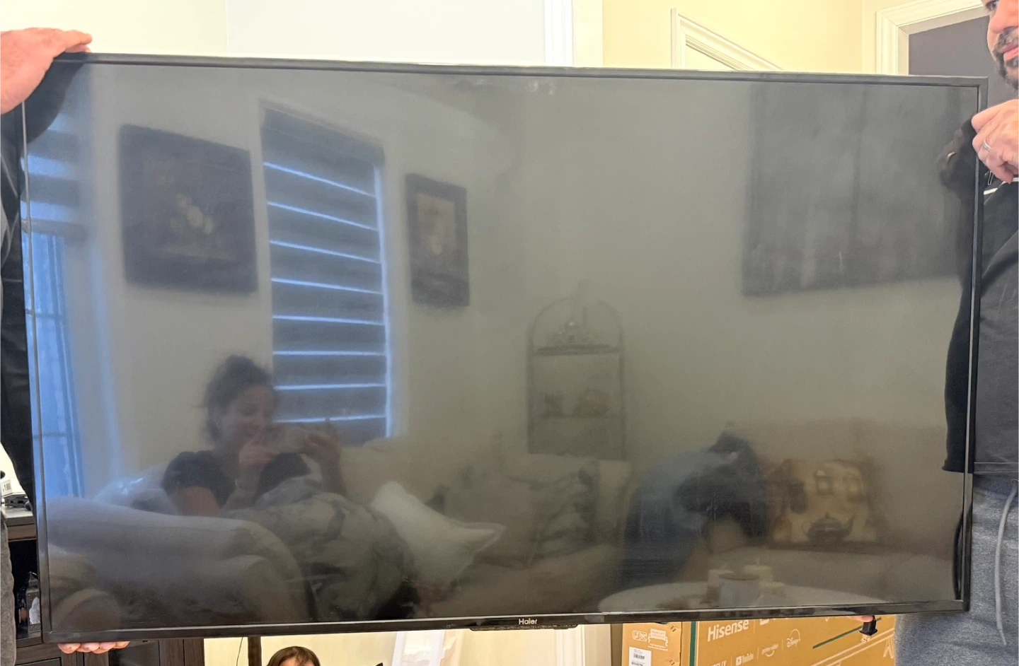 This is a Haier flat screen TV. It's a black, modern television perfect for your living room or entertainment space. It offers a clear and crisp viewing experience.