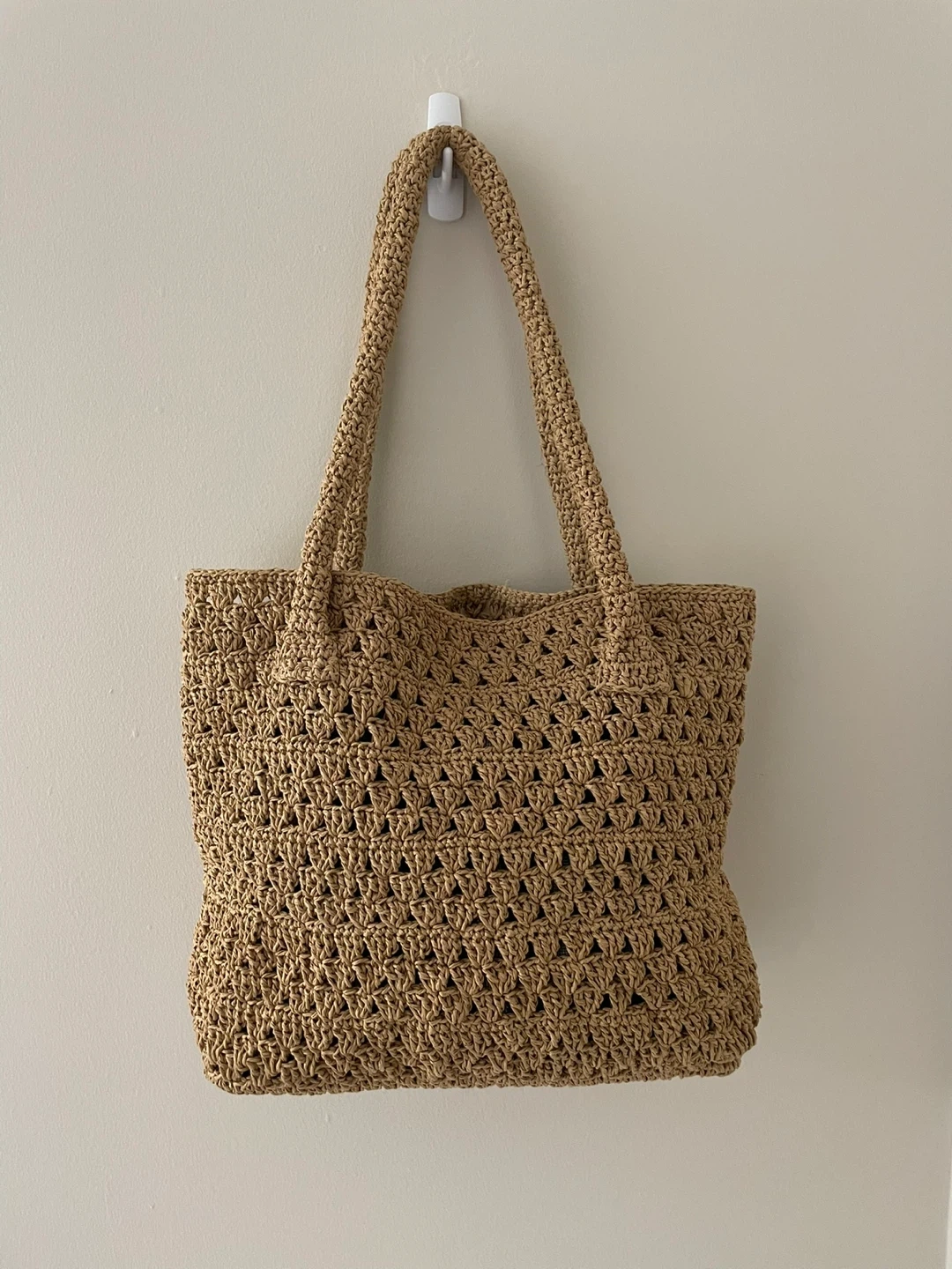 Handmade Light brown woven tote bag with braided handles. It's a stylish accessory for carrying your essentials. Made from straw-like material.