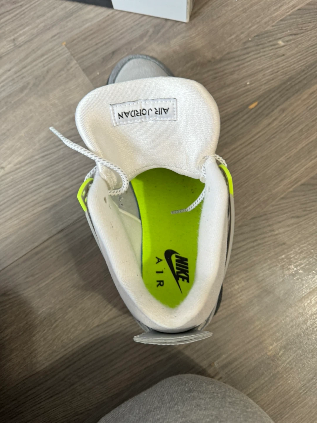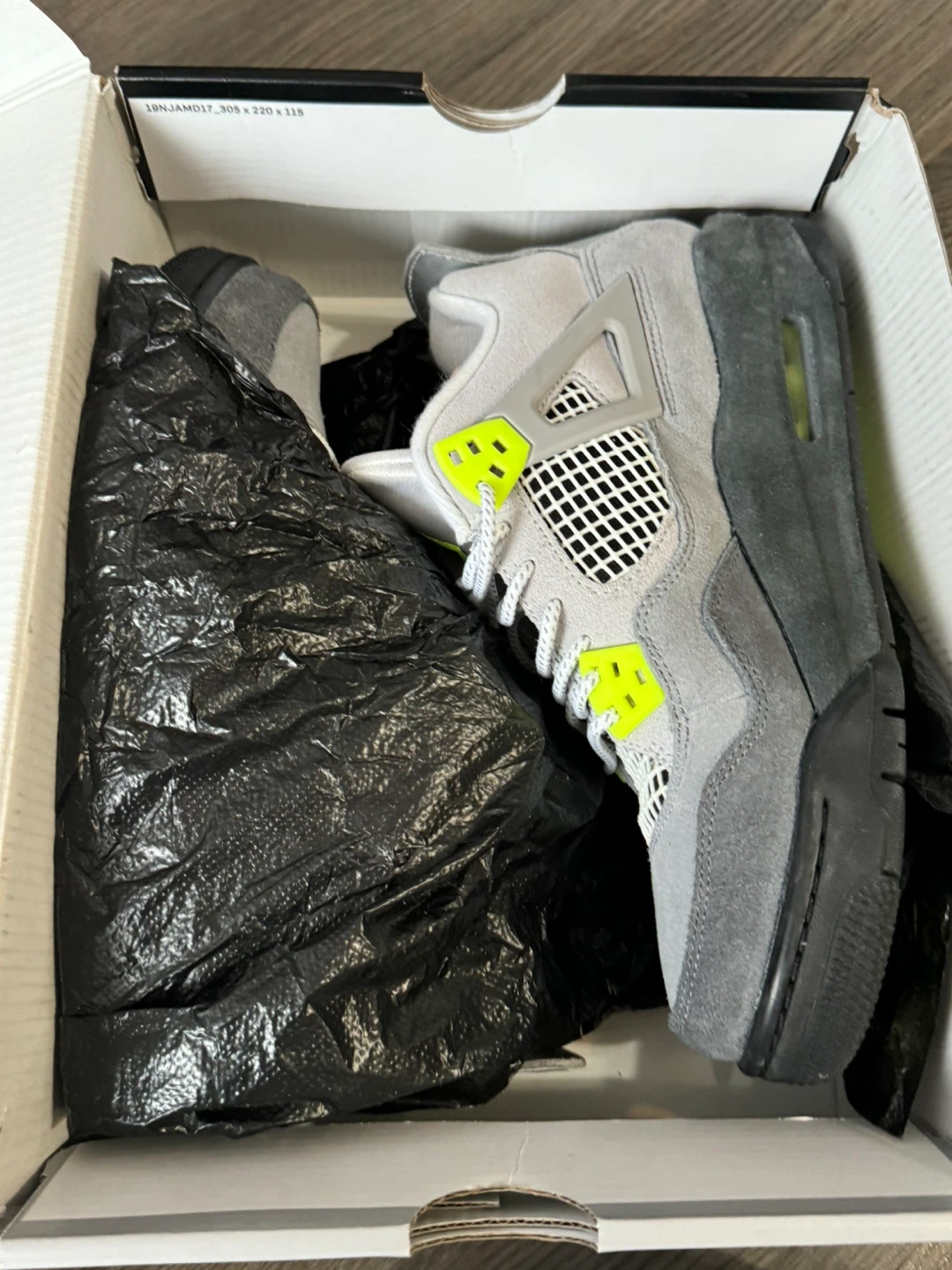 Air Jordan 4 Retro SE 2019 Grey suede and nubuck upper with neon yellow accents and black details. Features Jumpman logo on tongue and heel, and Nike Air cushioning. Comes with original box.