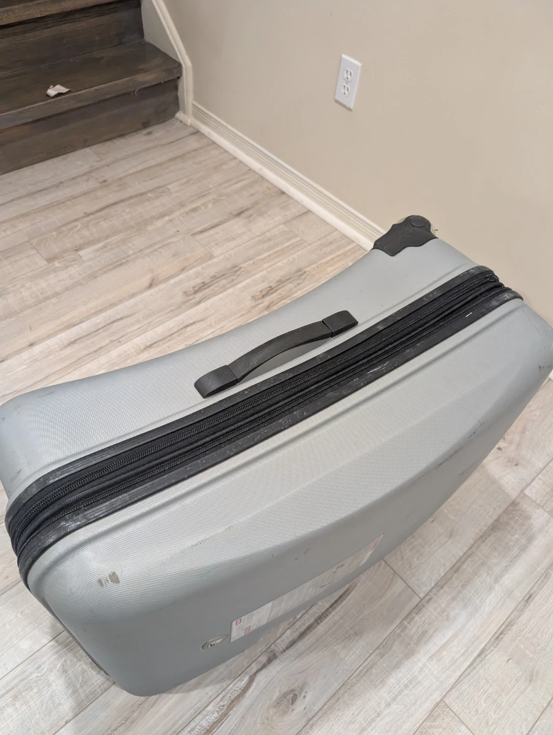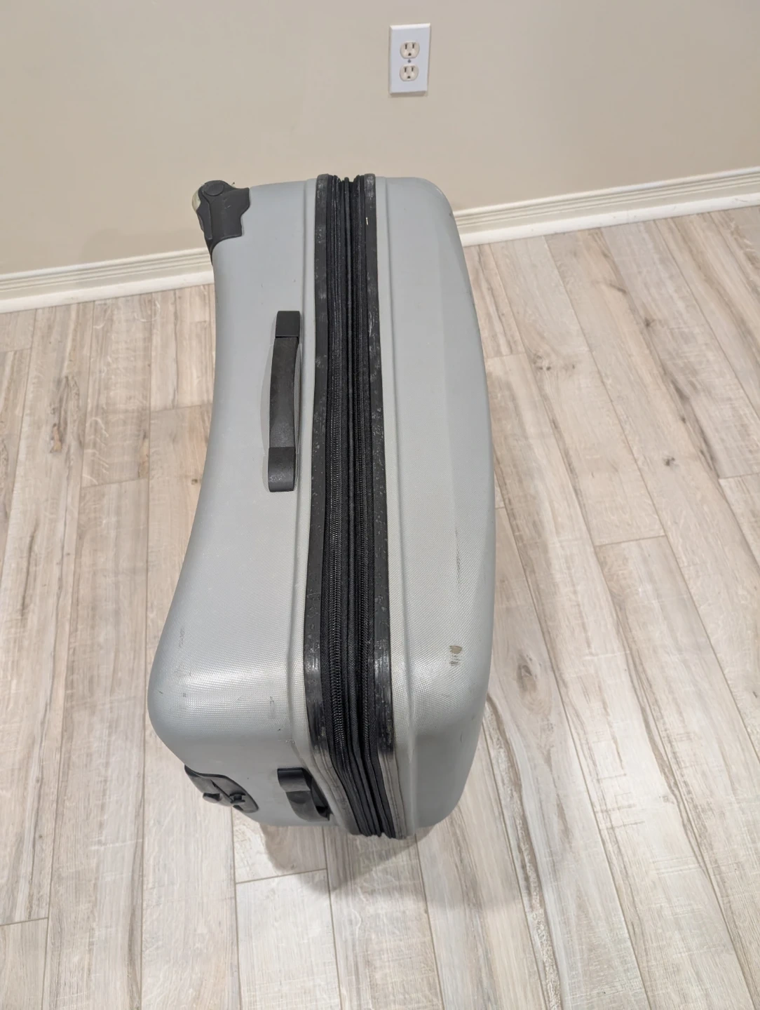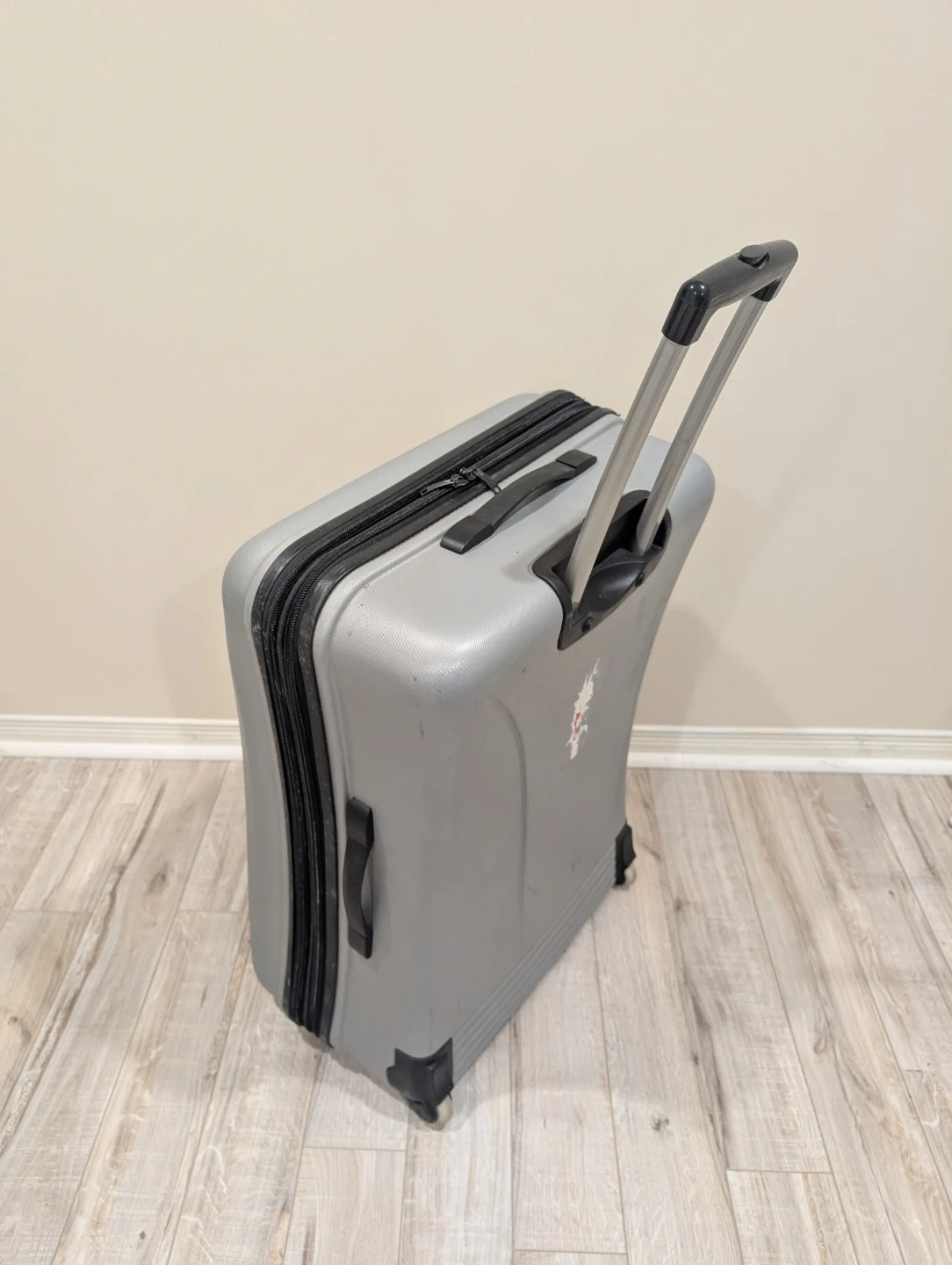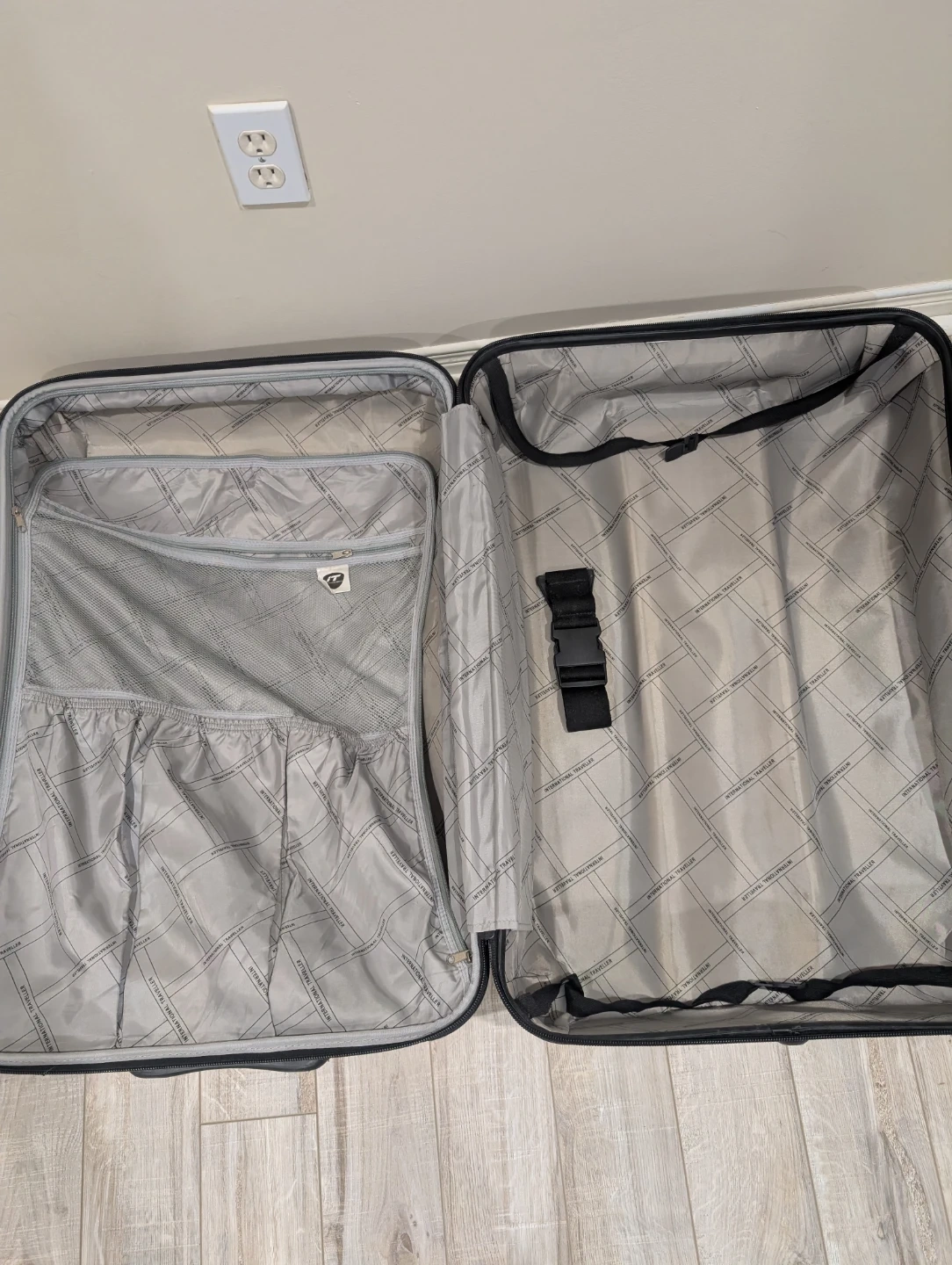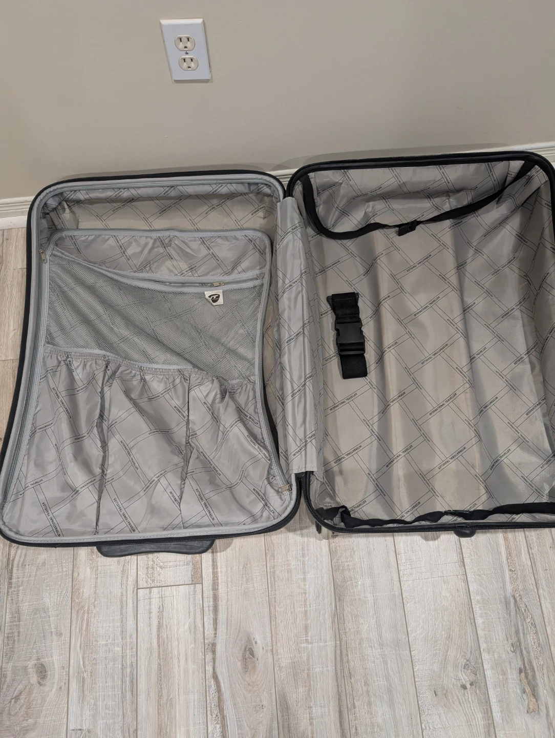 This is a grey International Traveller expandable suitcase. It's a durable piece of luggage with a telescoping handle and wheels for easy transport. Inside, there are tie-down straps and mesh pockets for organization.