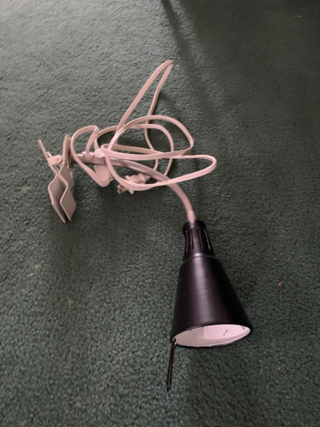 Selling a handy black clip-on desk lamp! It's perfect for a bedside table or desk where you need a little extra light. It has a clip to attach it to surfaces.