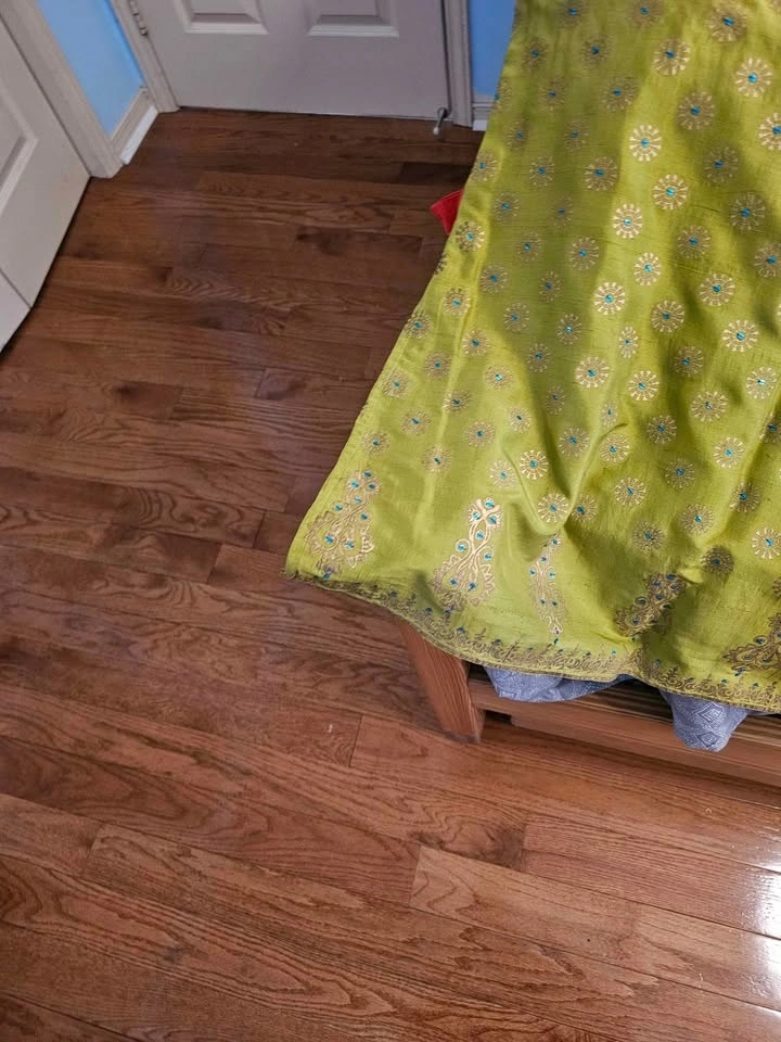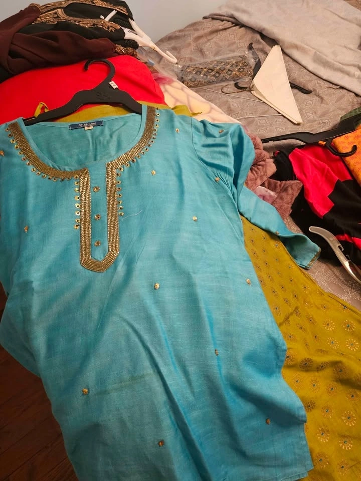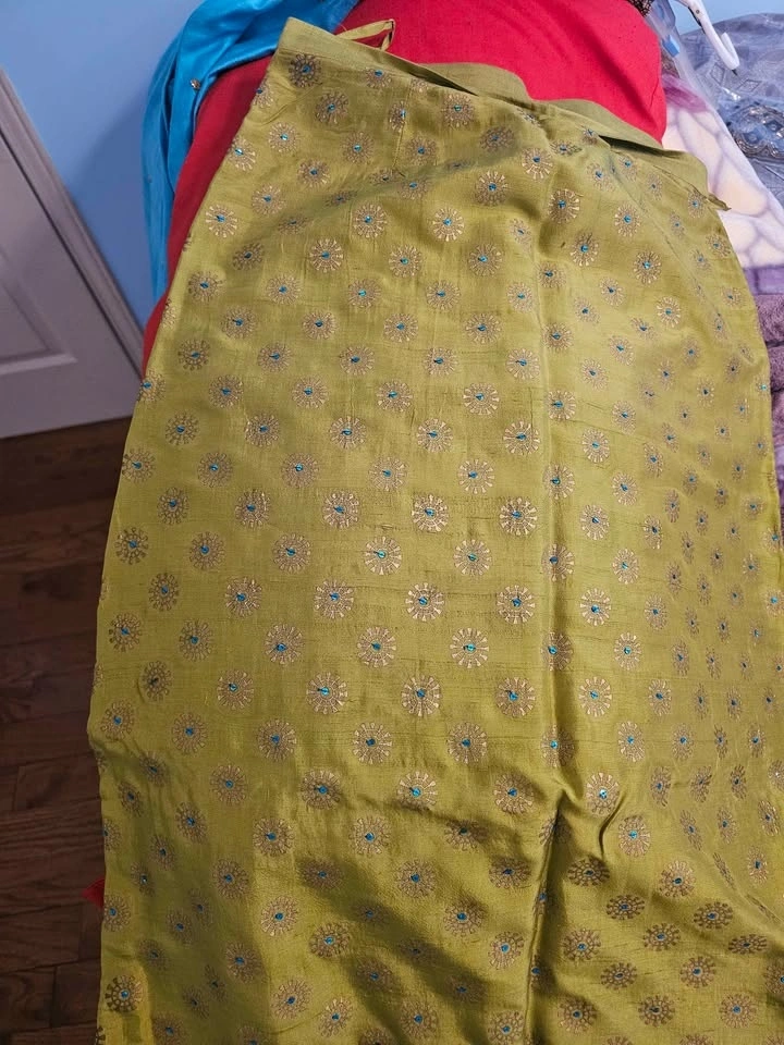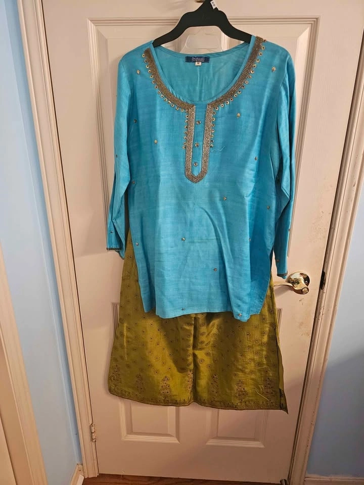 Worn once. This elegant and comfortable skirt set can be worn to formal or semi-formal events. Blue top with gold thread work and a green skirt with gold detailing and tiny blue gems. It's a gorgeous and very smart set. It is too small for me.