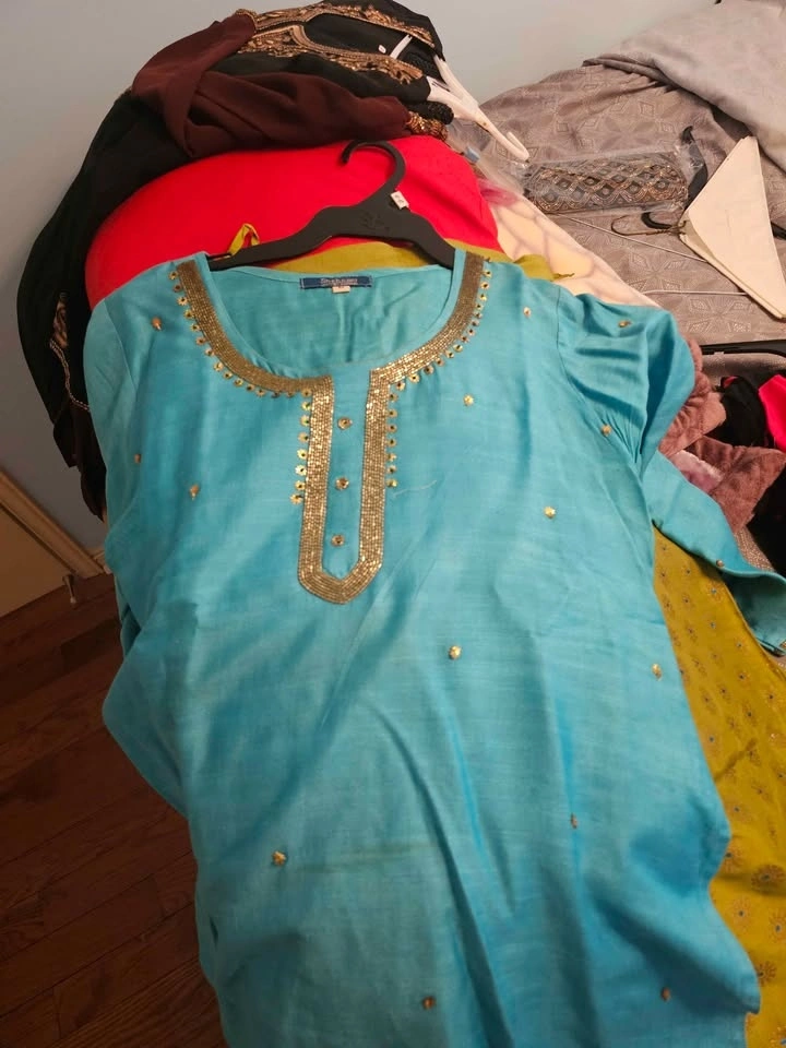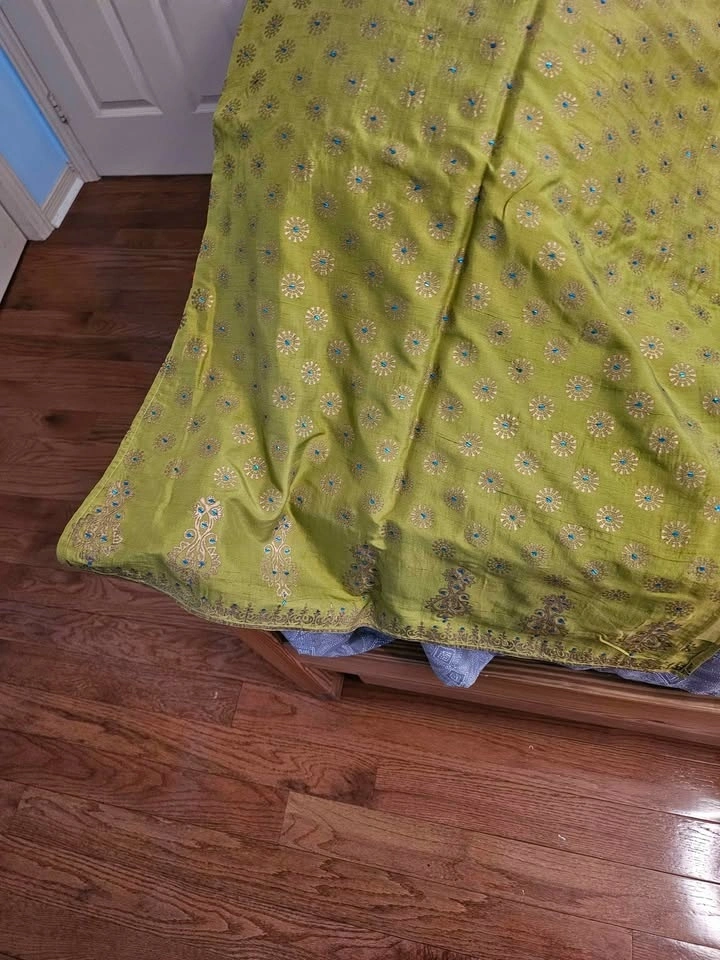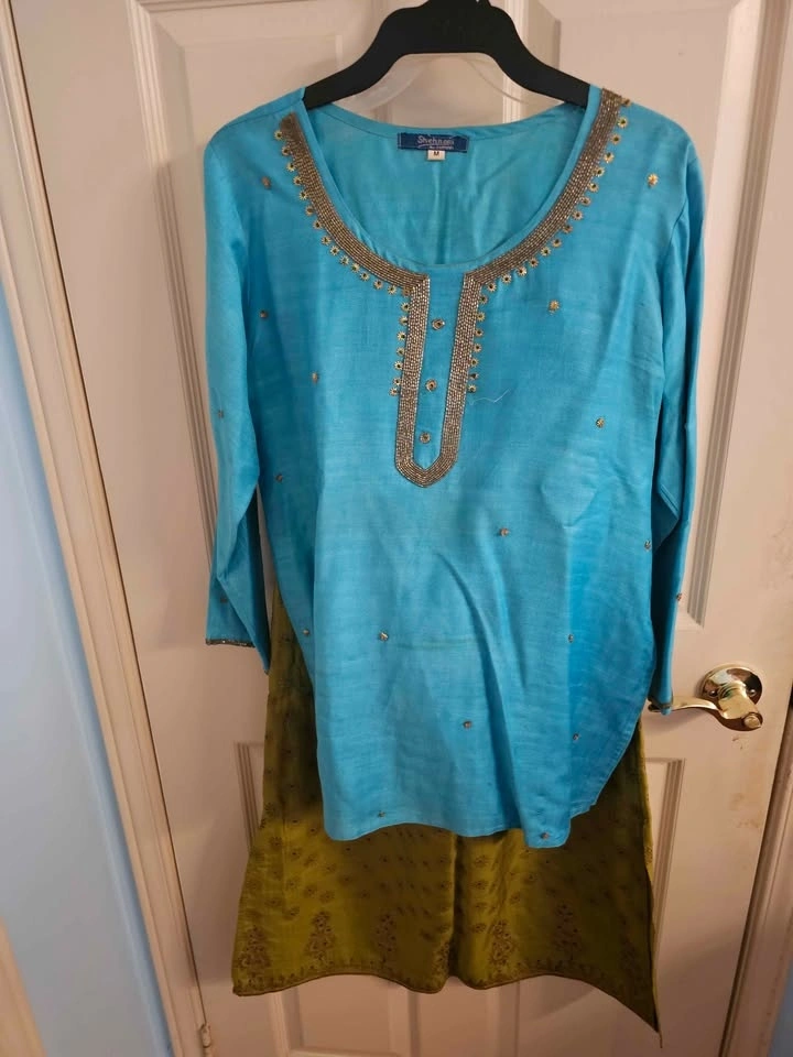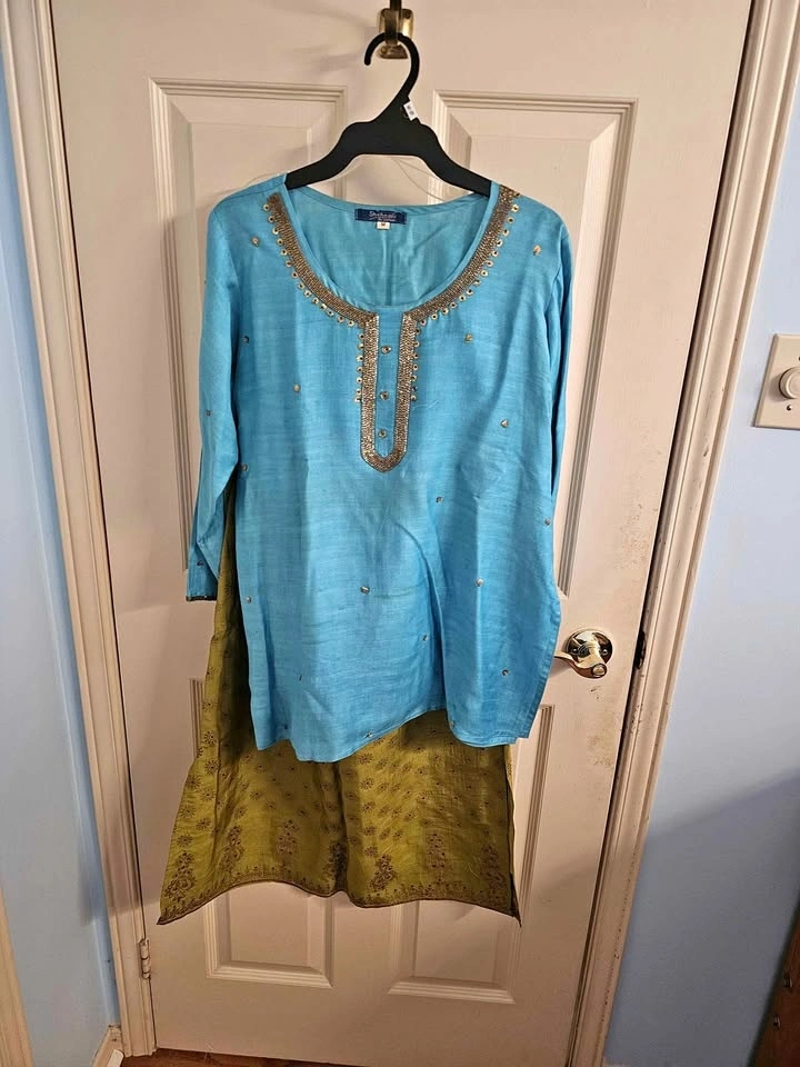 Worn once. This elegant and comfortable skirt set can be worn to formal or semi-formal events. Blue top with gold thread work and a green skirt with gold detailing and tiny blue gems. It's a gorgeous and very smart set. It is too small for me.